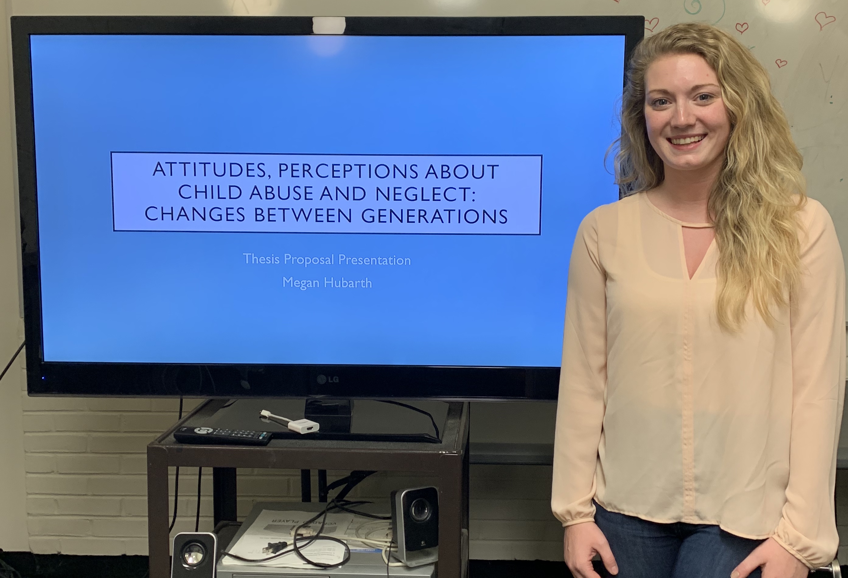 First year master’s student, Megan, recently presented an overview of her thesis proposal titled Attitudes, Perceptions About Child Abuse and Neglect: Changes Between Generations. Megan is interested in the perceptions of potentially harmful parenting techniques. She would like to analyze the differences in perceptions on child punishment across four generations—Traditionalist, Baby Boomer, Generation X, and Millennial—and if the gender and age of the child has an impact on those perceptions. Megan predicts that people will be more accepting of various forms of punishment if the child is older. She also predicts that punishments will be more acceptable within male children. Finally, Megan believes people will find punishment more accepting if they have experienced various forms of punishment themselves or if they are from the older generations. Megan hopes to gather data that can help clarify acceptable and unacceptable forms of punishment for children in society. This will help the general population better understand when certain forms of punishment are acceptable. We are excited to see what Megan finds and wish her the best of luck!