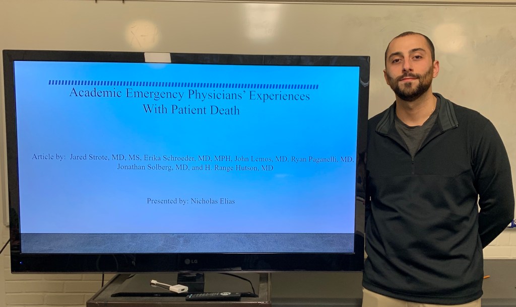 Recently, third semester undergraduate member, Nicholas, presented his article presentation and MOM preparation on Physicians’ Experiences with Patient Death by Jared Strote, Erika Schroeder, John Lemos, Ryan Paganelli, Jonathan Solberg, and Range Huston. This study aimed to identify the effects of patient death on emergency physicians (emergency medicine) and the coping mechanisms they us to deal with these events. The researches collected data from participants from four regions- mountain, south, southwest, and northwest-via surveys o measures of physical, emotional, and life encountering death, training experiences, emotional responses and coping strategies of the physicians. Data as looked at through chi-square analysis to evaluate the relationship between responses and the independent variables. Results showed significant results among gender differences, yeas since residency when compared to physical symptoms after patient death. Results also showed significance with years since residency and frequency of witnessing death among sever actions or changes among the physicians. Lastly, they found that participants reported rarely receive debriefing after the deaths, and emergency physicians coping mechanisms in response to patient deaths consisted mostly of talking with colleagues and friends/family. Great wok Nicholas!