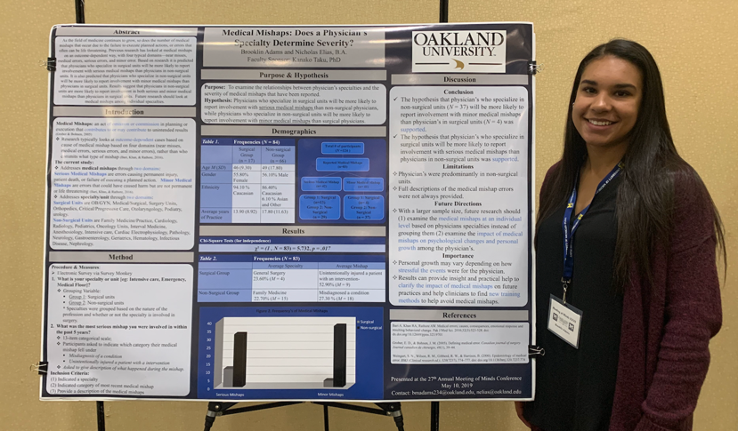 Brooklin also presented her and Nico’s research project titled Varying Effects of Experience has on the Kinds of Medical Mishaps Occurring During a Physician’s Practice. They examined how years in-practice can influence the severity of medical mishaps a physician made within the past five years. They predicted that physicians who have been practicing in their specialty for less than 10 years would be involved in medical mishaps considered “missed information” while those practicing for 11 years or more would make medical mishaps considered “potentially harmful.” Even though the research did not yield significant results, it helps in understanding the importance of medical mishaps, and how they are committed. It also furthers the discussion of creating training programs that teach physicians how to avoid medical mishaps, and what to do if they do happen.