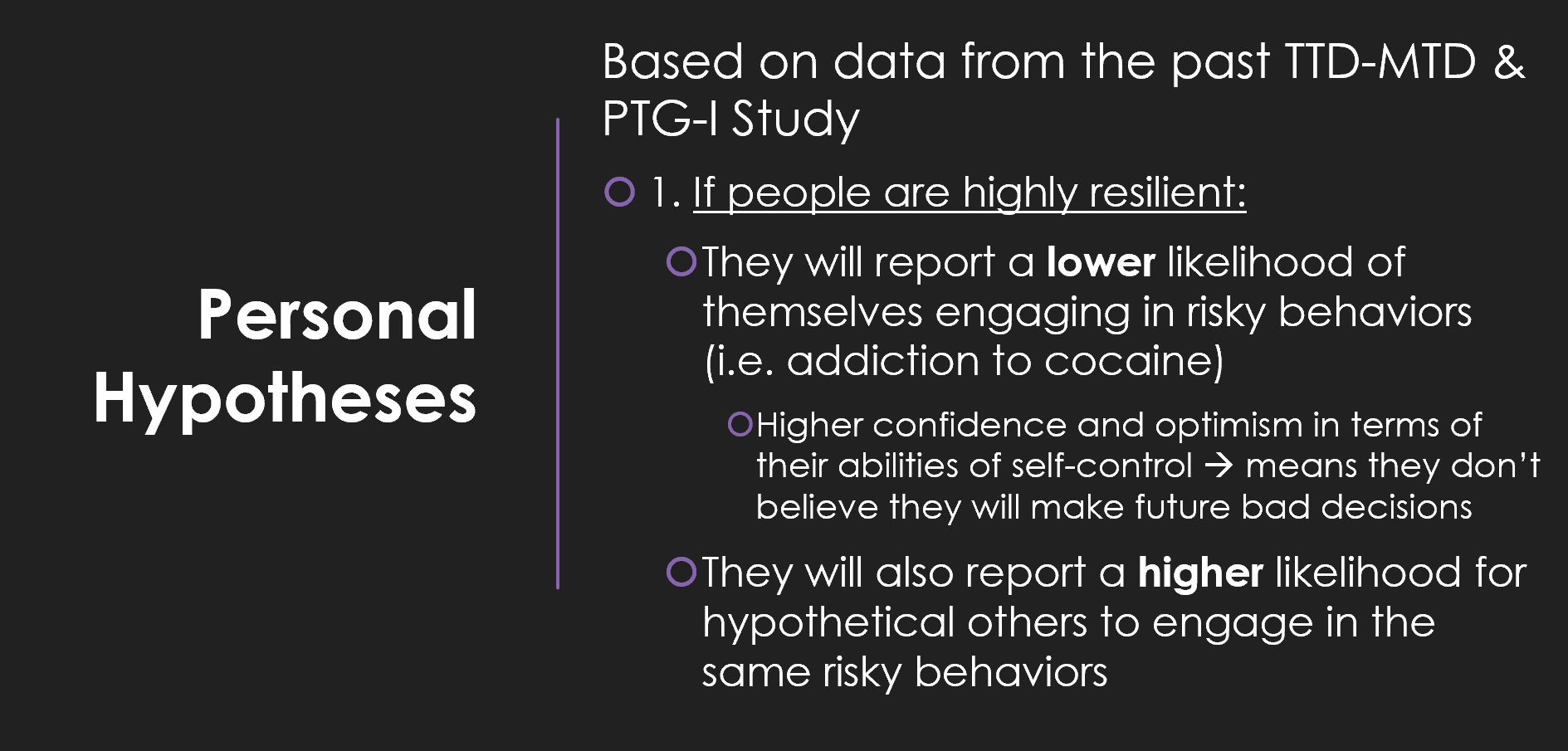 In addition to her analysis of the article, Emilee’s presentation covered a set of hypotheses she prepared for her Honors College Thesis regarding a similar idea on the topic of resilience and the possible detrimental effects it may have on individuals. In her future analysis, Emilee predicts that participants who are highly resilient will report a lower probability of negative life events happening to themselves – the reverse being true when evaluating a hypothetical other person experiencing the same event. Great work Emilee, we are looking forward to your future findings!