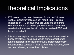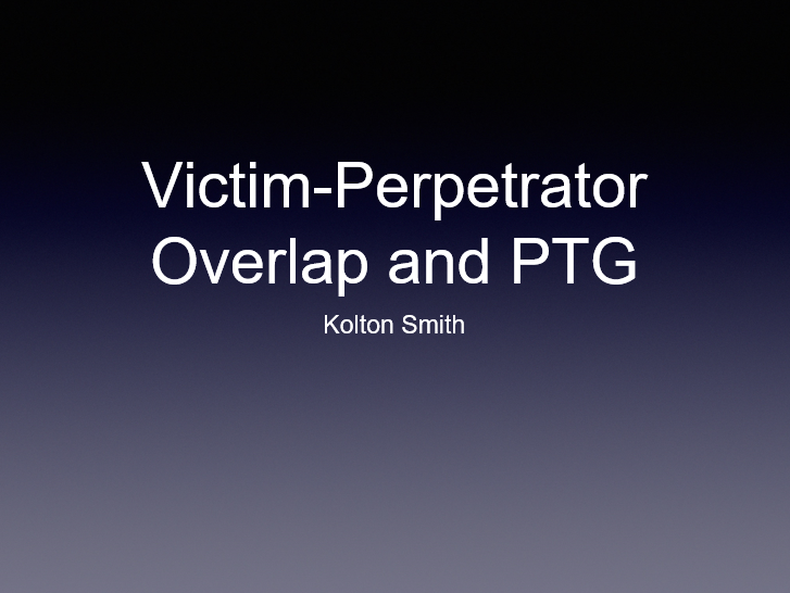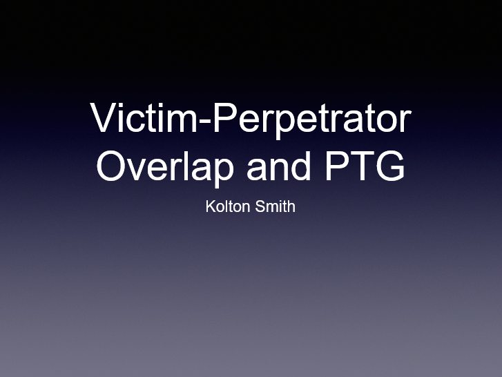 Some literature indicates that perpetrators are capable of experiencing PTG, especially if they were originally a victim of trauma or abuse. Therefore, Kolton wants to investigate whether or not someone who experienced PTG will go on to become a perpetrator. He predicts that people who experience PTG will be less likely become a perpetrator. Additionally, he predicts that compared to participants who start with questions regarding being a perpetrator, those who first answer questions about being a victim will be less likely to report instances of being a perpetrator. Great job Kolton, we look forward to hearing more about your thesis!