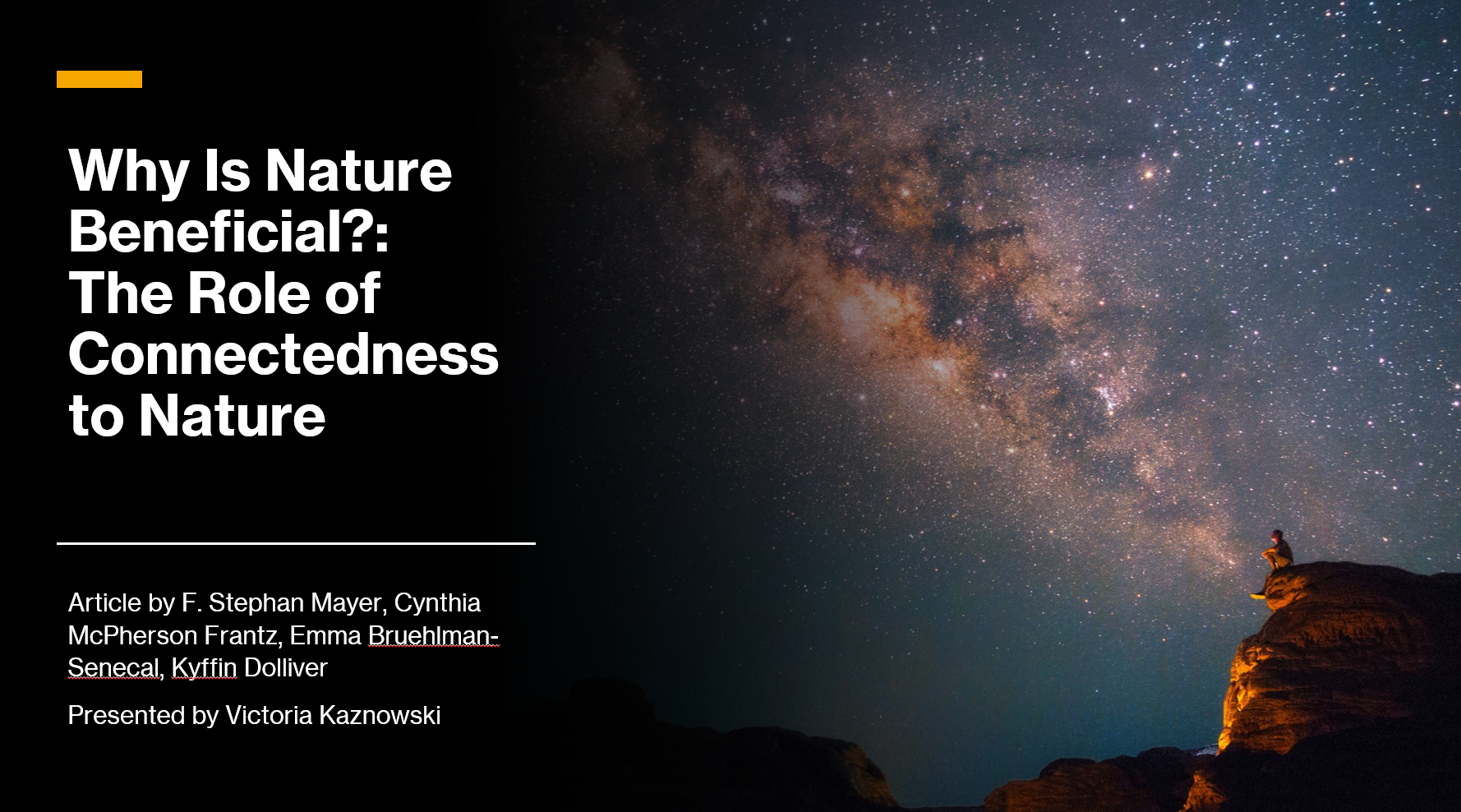 First semester undergraduate lab member Victoria recently gave a presentation on the article titled Why is nature beneficial?: The role of connectedness to nature. The study wanted to directly investigate the relationship between nature and well-being, with a sense of belonging to the natural world as the primary mechanism. Prior studies focus on the restorative qualities of nature without exploring the other possible mediating factors. The major research questions asked were: (1) does an increase in connectedness to nature mediate nature’s effect on positive mood? and (2) does exposure to nature affect participants’ ability to reflect on their personal problems? The authors proposed the questions to determine the extent to which an individual’s environment can be healing. To answer these questions, the researchers randomly assigned a group of college students into two groups, one of which would spend 10 minutes on a walk in a nature preserve, the other group walking around a downtown urban environment. After the 10 minute walk, each group was given 5 minutes of reflection time and then filled out a survey to measure (1) connectedness to nature, (2) positive and negative affect, and (3) situational self-awareness.