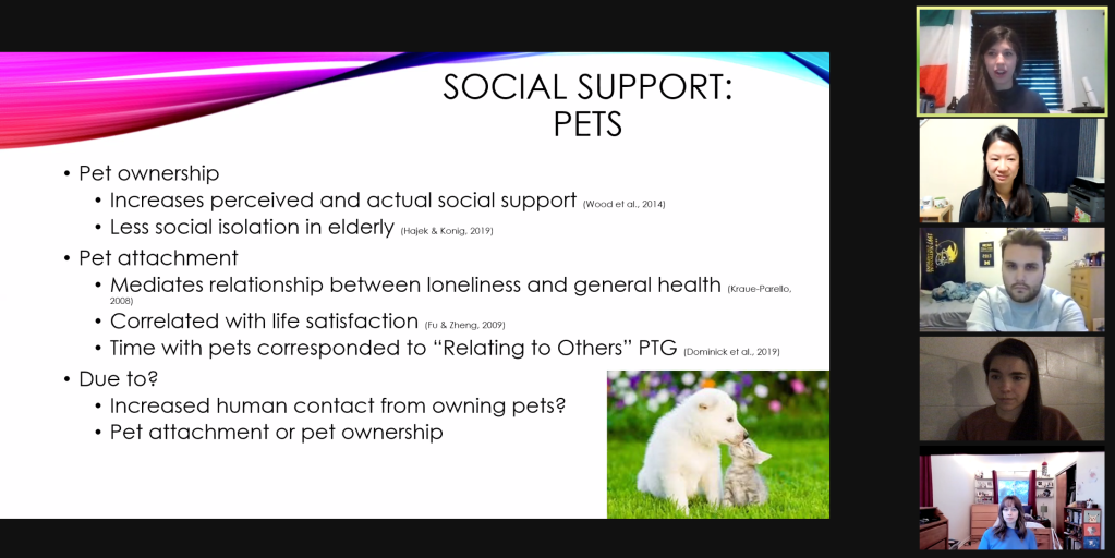 Dr. Dominick presented an update on her latest research project, “COVID-19, social support, and posttraumatic growth“. The purpose of her study is to examine the impact of the current COVID-19 pandemic on posttraumatic growth (PTG), core belief disruption (CBI), perceptions of social support, and usage of alternative support sources. The aspects of social support include human connection, pets, and social media. The impact of the COVID-19 pandemic on PTG, social support, and CBI and the relationship between different types of stressful events (mainly the pandemic and politics) and their impact on PTG, social support, and CBI were examined through repeated measures ANOVA and independent sample t-tests.