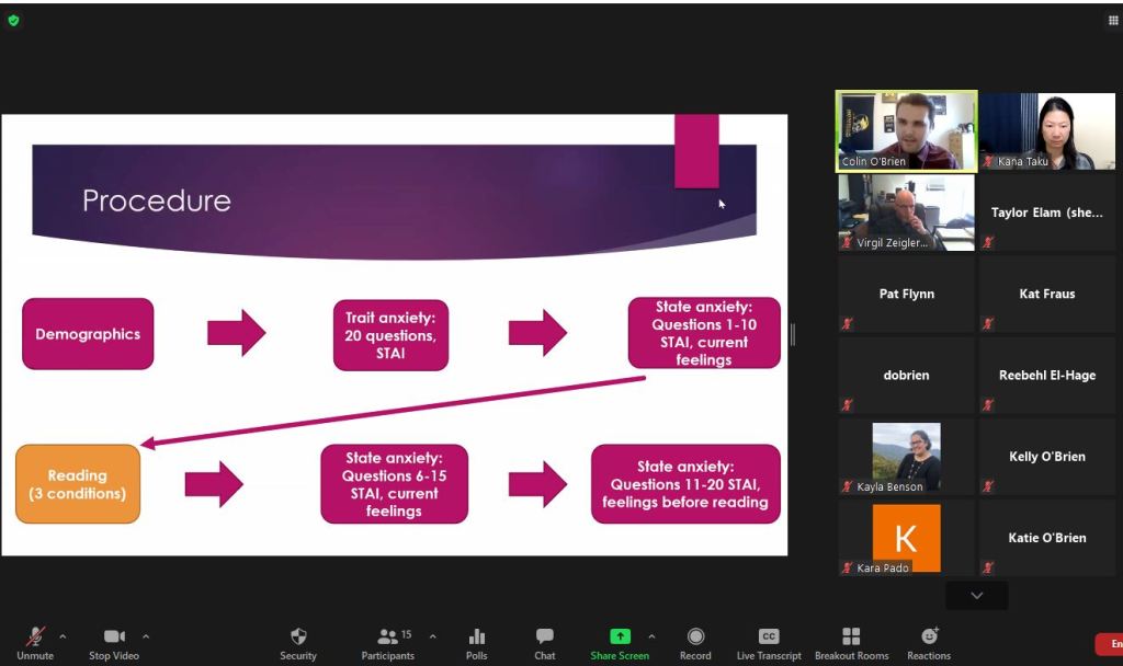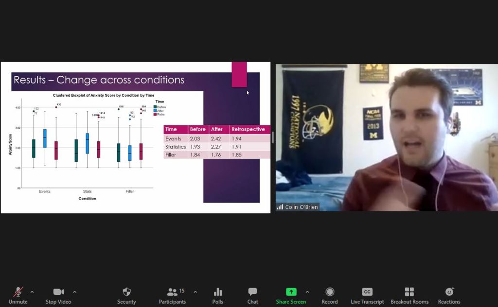 A second-year Master’s student, Colin O’Brien, successfully defended his master’s thesis titled, Types of Change in Anxiety Regarding Mass Shootings in Response to New Information.