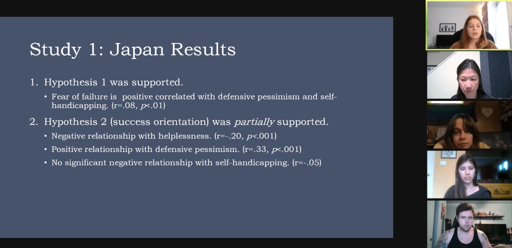 Last week, Isabelle gave her first presentation in the lab titled Unmotivated or Motivated to Fail? A Cross-Cultural Study of Achievement Motivation, Fear of Failure, and Student Disengagement that focused on the Quadripolar Model of achievement motivation.
