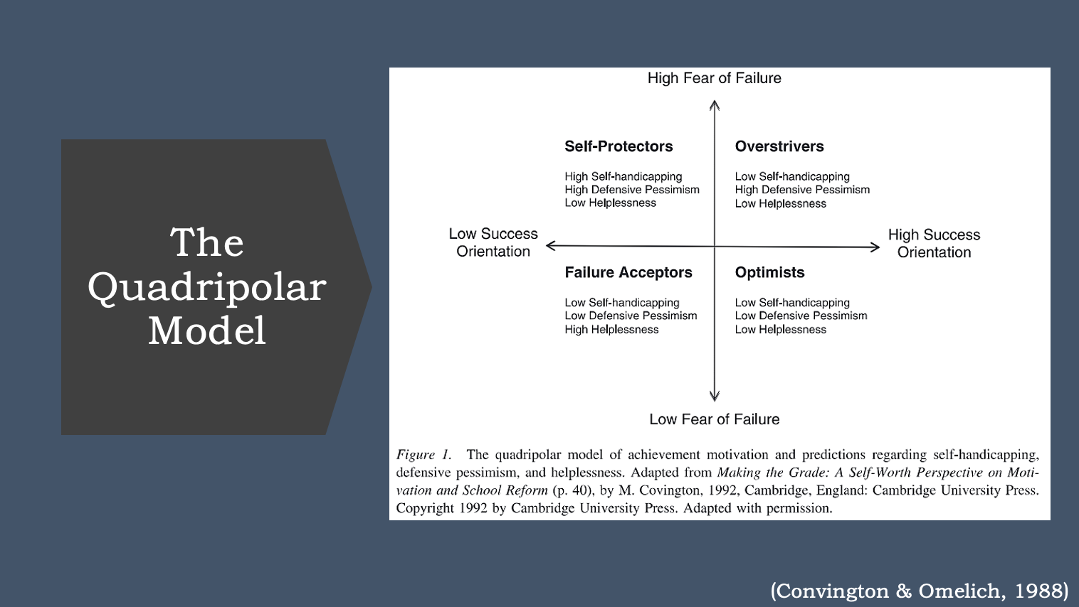 The Quadripolar Model categorizes students into groups based on level of success orientation and level of fear of failure and is used to predict which individuals may be susceptible to self-handicapping, defensive pessimism, and helplessness when it comes to academics. The purpose of the article being presented was to incorporate and strengthen research on achievement and motivation related to success orientation, fear of failure, and disengagement through a cross-cultural comparative design based on the self-worth theory. One study was conducted in Japan and another study was done with an Australian sample that both assessed the students’ tendency to approach success, failure appraisal, and patterns of adaptive learning. It was predicted that fear of failure would positively associate with maladaptive coping mechanisms and specifically positively associated with self-handicapping in the self-protector group. For failure acceptor students, the researchers predicted that there would be an interaction between success orientation and fear of failure in helplessness attributes. Another prediction was that success orientation would negatively associate with self-handicapping and helplessness while positively associating with defensive pessimism.