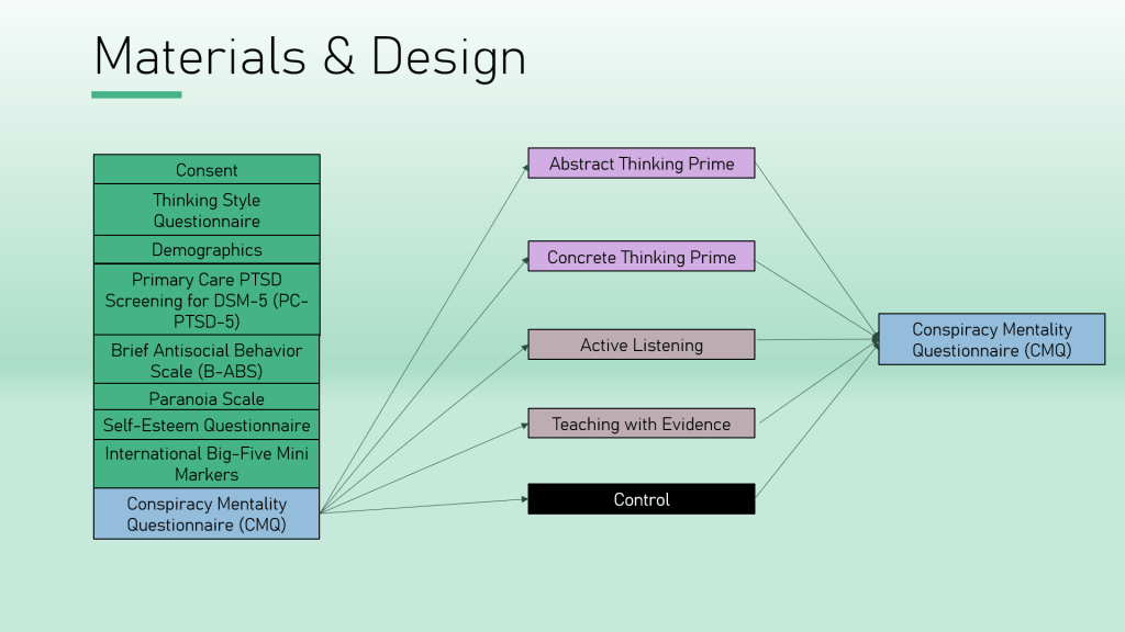 The study will collect data from university students and the broader community virtually through online questionnaires, thinking style priming tasks, and therapeutic interventions. It starts with the survey which measures PTSD symptoms, paranoia, thinking style, self-esteem, antisocial behavior, personality, and general conspiracy beliefs. Participants will then be primed with either a thinking style or engaged in a therapeutic technique. The priming tasks involve reading a passage and completing a series of either “how” tasks or “why” tasks to prompt them to think about how they would go about achieving a goal or why they want to achieve that goal. Participants in the therapeutic technique conditions will engage in either an active listening session where the focus is listening to the participant’s beliefs or teaching with an evidence session focused on explaining why certain conspiracies are not true. There will be a control group and the participants’ levels of general conspiratorial belief will be measured in all before and after the intervention.