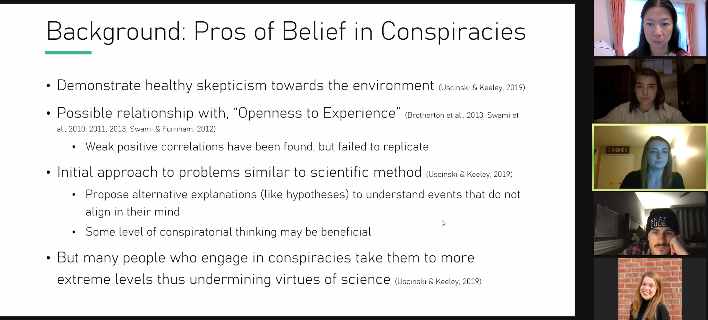 Kaylie hopes her research will contribute to our understanding of how thinking styles influence conspiratorial beliefs and motivate the proposal of interventions for those who believe in conspiracies. The results could also lend to an understanding of what types of individuals are most vulnerable to being convinced that conspiracies are true, which benefits the development of specific treatments for maladaptive levels of these beliefs. Belief in conspiracy theories has resulted in individuals and groups of people engaging in violent acts, so strengthening our grasp on the issue could benefit the safety of those affected by these acts and the people whose beliefs cause them. This is a very intriguing project, Kaylie! We look forward to hearing more as it further develops.