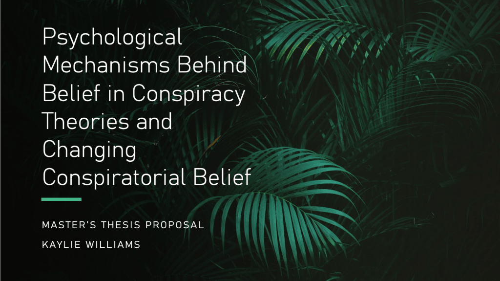 Congratulations to first-year Master’s student, Kaylie, on her successful proposal presentation, which has been approved by the committee. Recently, Kaylie presented an overview of her master’s thesis proposal titled, Psychological Mechanisms Behind Belief in Conspiracy Theories and Changing Conspiratorial Thinking. Kaylie’s proposal discussed what influences conspiratorial thinking in people, how to change those beliefs, and explored the relationship between mental illness, trauma, and conspiracy beliefs. Since there is no current research on trauma and belief in conspiracy theories, Kaylie hopes to use the data she gathers to establish a foundation for the literature. The results from the study could help push the boundaries of research into exploring different theories of thinking, such as Kahneman’s Dual Process Theory, as well as exploring different therapeutic styles to contribute to interventions designed to change conspiratorial thinking. Kaylie’s next step will be to submit her study protocol to the IRB to get approval, after which she will be ready to collect her data.