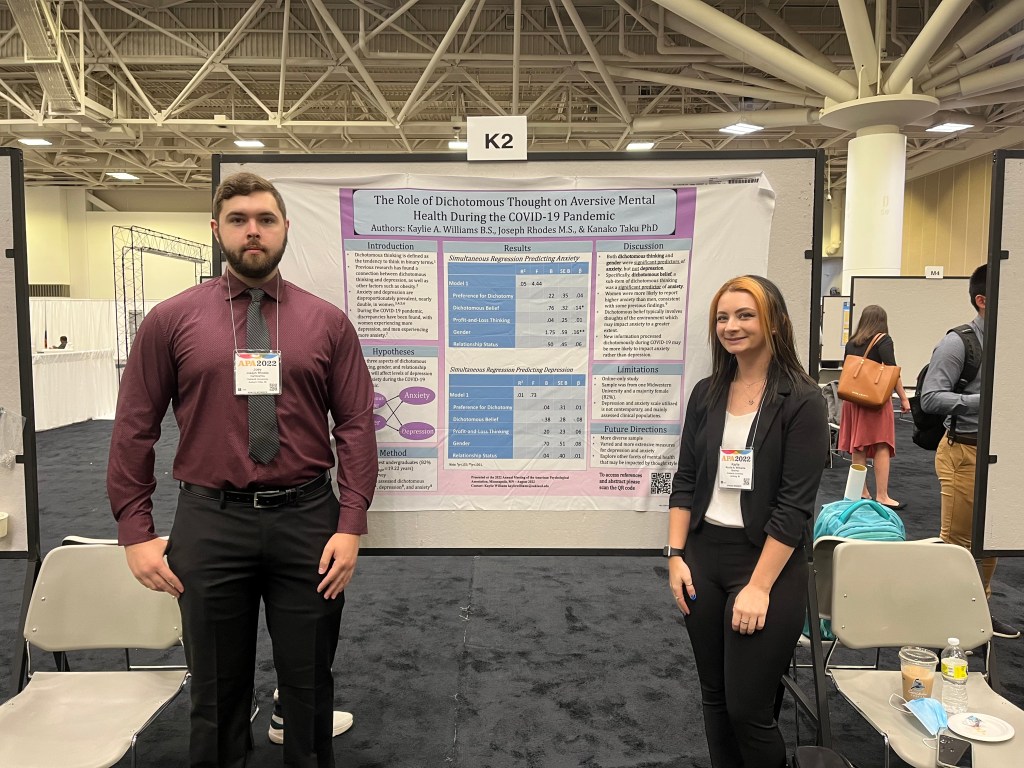 Kaylie and Joey were first to present their poster titled The Role of Dichotomous Thought on Aversive Mental Health During the COVID-19 Pandemic. This research, which originated from Joey’s Master’s Thesis, found that both dichotomous thinking (thinking in polar opposites) and gender were significant predictors of anxiety during the COVID-19 pandemic but not depression. They believe these findings may be due to how dichotomous thinking typically involves thoughts of the environment which aligns more with anxiety than depression. Whereas depression may align more with thoughts of oneself.