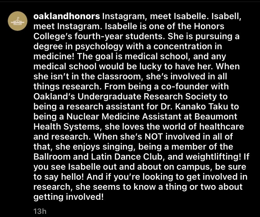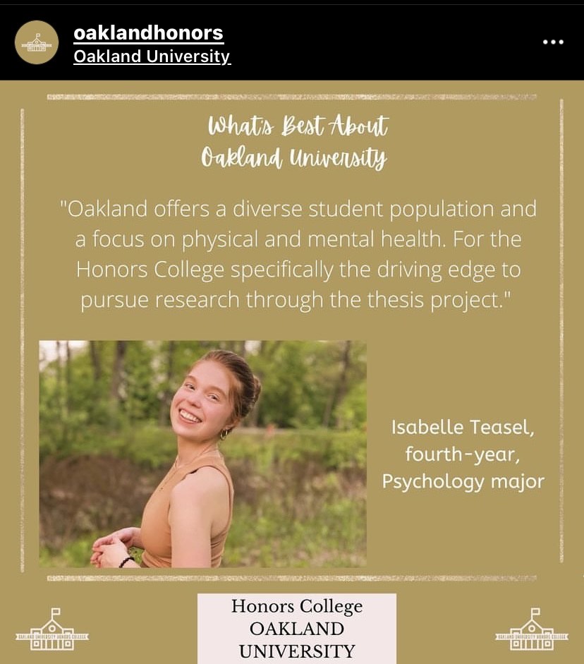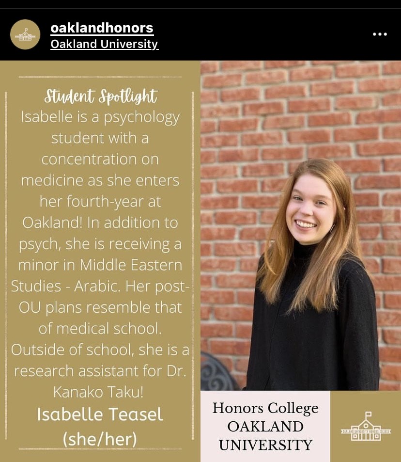 We are really excited that our new lab manager, Isabelle Teasel, has been featured on Instagram by Oakland University’s Honors College. Here is the link!