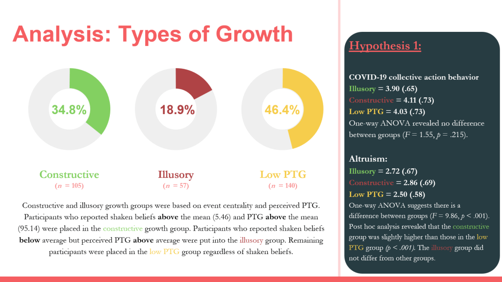 After the completion of data analysis, hypothesis 1 of those who report PTG in response to events high in event centrality (constructive growth) will report more collective action behaviors than those who report PTG following low centrality events (illusory growth) was not supported. However, if using altruism as the outcome, the first hypothesis is partially supported, since constructive growth is higher than the low PTG group but no different from the illusory group. Hypothesis 2, narcissism and/or optimism will be higher in participants defined as having illusory growth, was not supported. It is important to note that the results were consistent with the literature that PTG is positively associated with optimism.