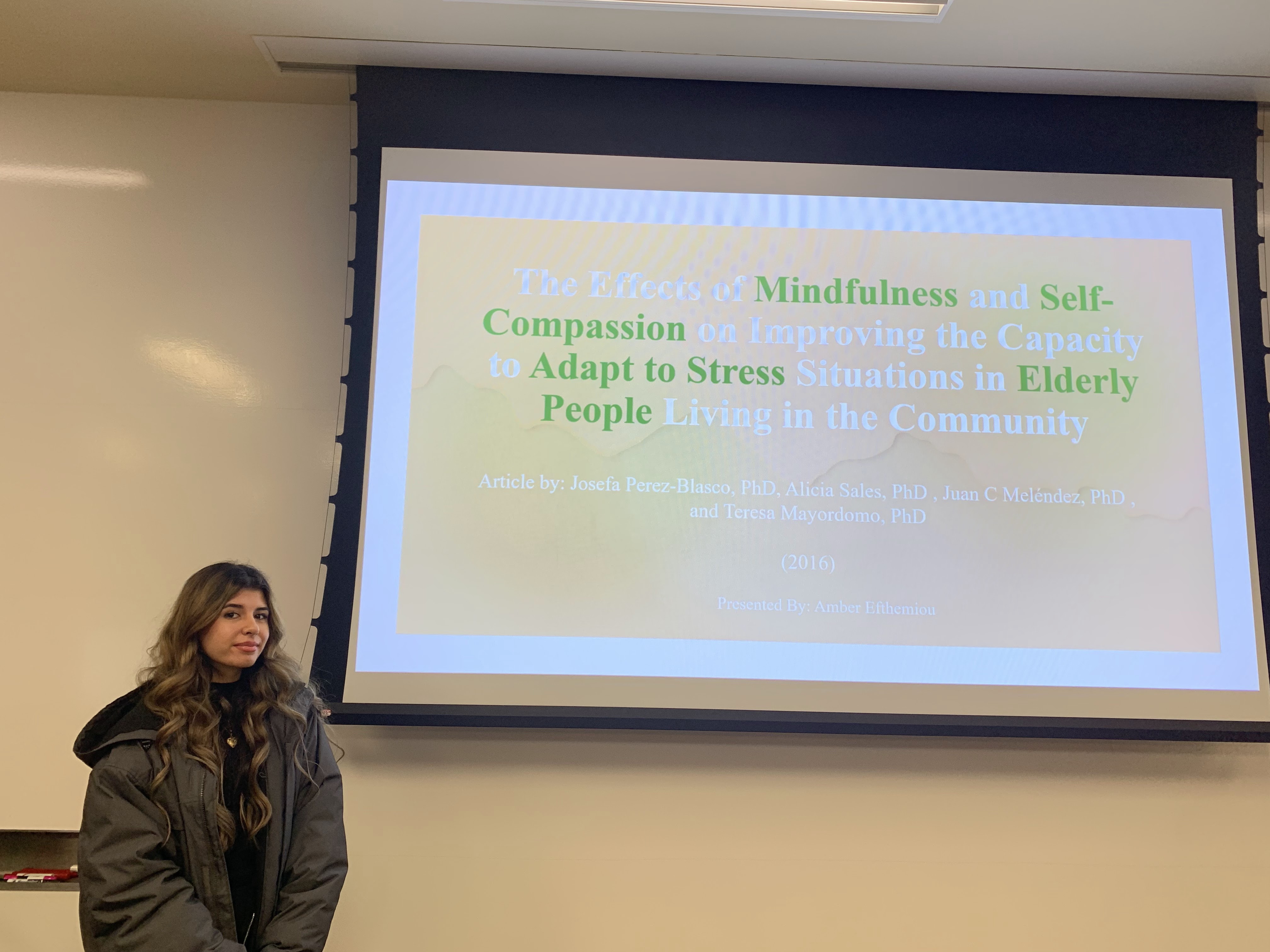 First-semester undergraduate research assistant, Amber Efthemiou, recently presented the article titled, “The Effects of Mindfulness and Self-Compassion on Improving the Capacity to Adapt to Stress Situations in Elderly People Living in the Community” (Perez-Blasco et al., 2016).