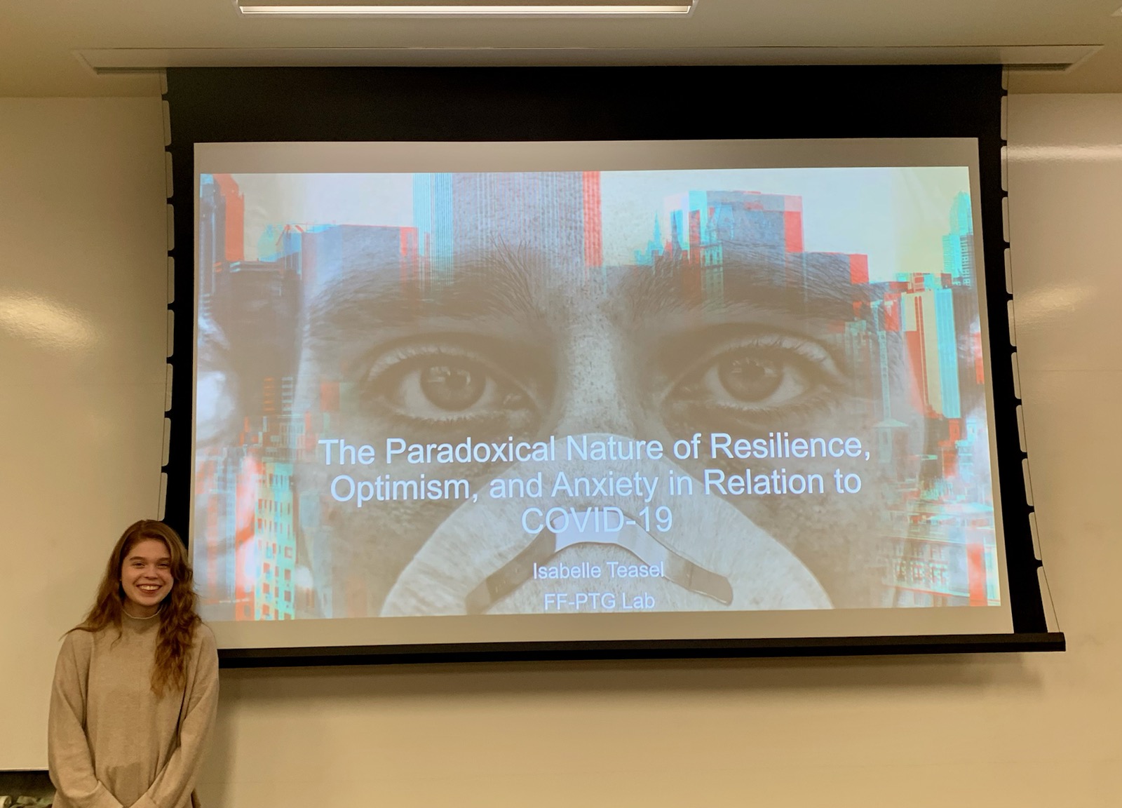 Senior lab member, Isabelle Teasel, gave a presentation on her Honor’s College Thesis titled, “The Paradoxical Nature of Resilience, Optimism, and Anxiety in Relation to COVID-19.” The project focuses on the paradoxical relationships between resilience, optimism, and anxiety in the context of the COVID-19 pandemic.