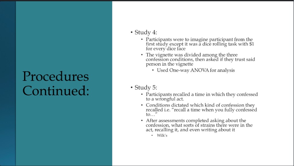 While confessions were not manipulated, this study gives insight into the prevalence and some of the potential outcomes and perceptions. It showed that others’ partial confessions were viewed as more credible than no confession at all and led to many future research directions for Paxton. He will be conducting his own study based on his interest in confessions and lying. We are excited to see what he accomplishes!