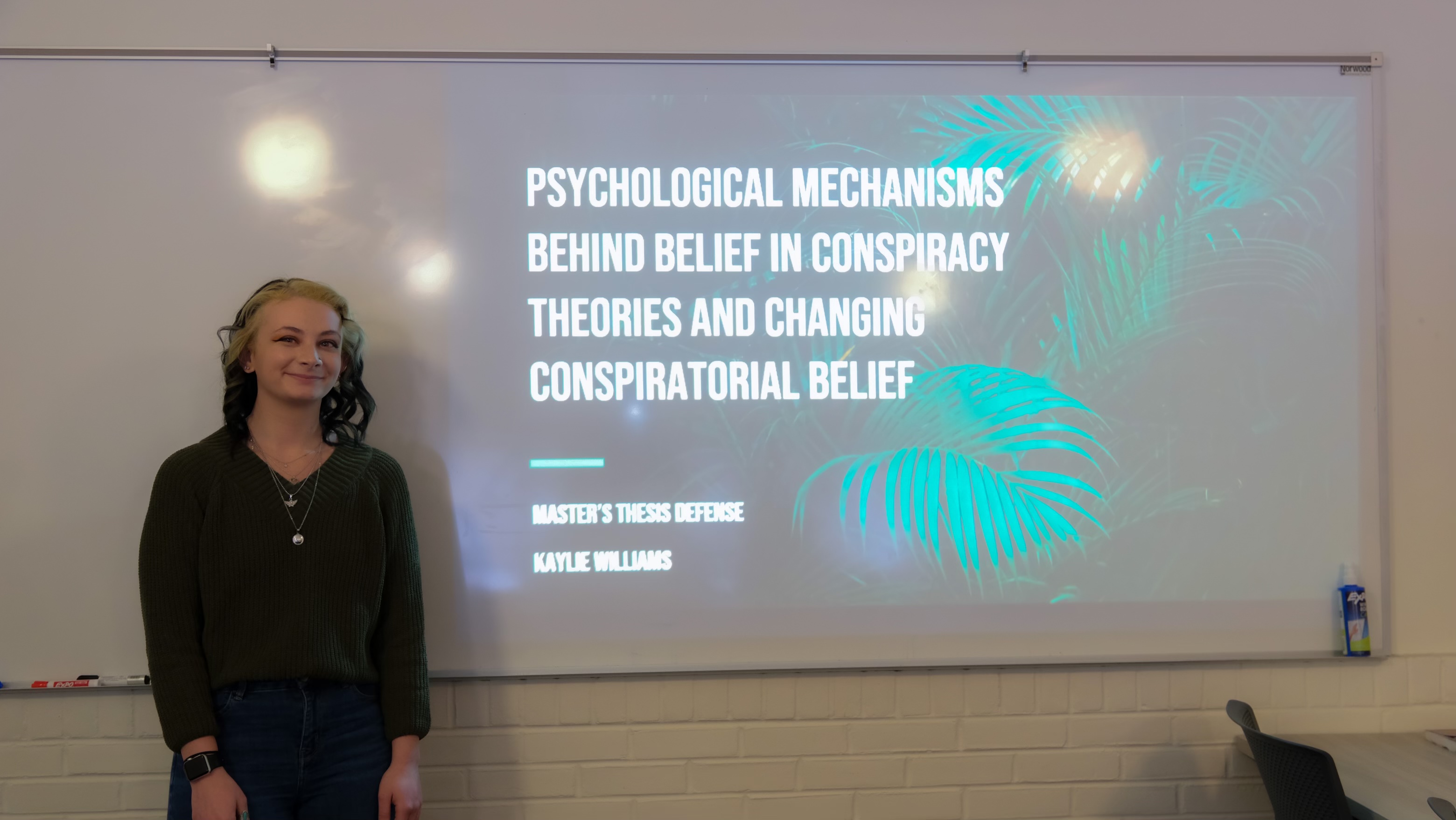 Thesis season is here at the FF-PTG Lab! Kaylie Williams, a Master’s student, defended her thesis on conspiracy beliefs and different thinking styles. Conspiracy beliefs are alternatives to widely believed explanations for an event. These conspiracy beliefs often assume that one explanation is staged and often is done to harm others. The ways in which people think would influence how they interpret and begin to believe, the information provided by a conspiracy belief. In Kaylie’s research, different thinking styles were used to attempt to change the way people think about conspiracies. These thinking styles were measured in order to observe which are consistent with conspiracy beliefs. Some of the thinking styles included In her experiment, abstract and concrete thinking were used in an attempt to influence an individual’s conspiracy beliefs. It was hypothesized that abstract thinking would show increased conspiracy beliefs. As for concrete thinking the opposite would be true. In general, as well individuals higher in the following were hypothesized to show higher conspiracy beliefs as well: symptoms of PTSD, antisocial behaviors, vaccine hesitancy, low medical trust, paranoia, and more openness to experience.