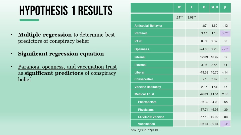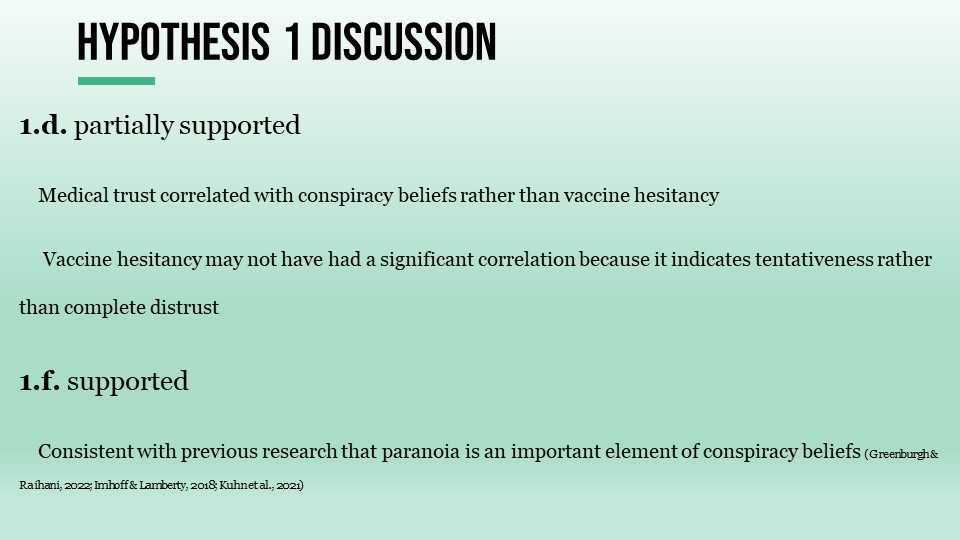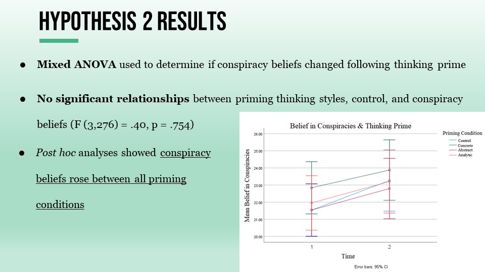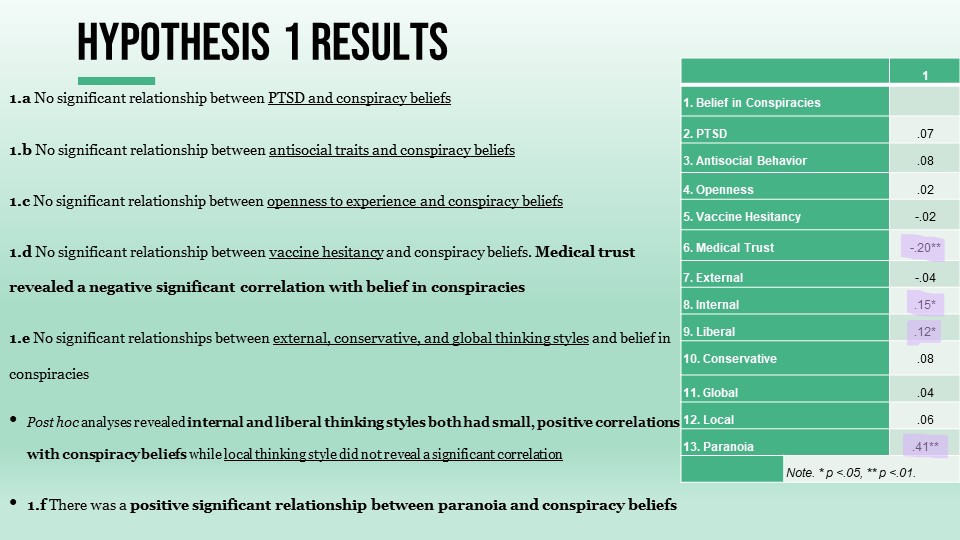Of the many hypotheses, there were a couple that was either fully or partially supported. The first of which is medical trust and vaccine hesitancy. The medical trust had a significant negative correlation with conspiracy beliefs. Unfortunately, the same was not found for vaccine hesitancy. The rationale is that vaccine hesitancy may have measured individuals more cautious of the vaccine rather than outright believing conspiracies related to the vaccine. As seen in previous research, Kaylie was able to replicate the positive relationship between paranoia and conspiracy beliefs. The thinking styles did not influence individuals’ conspiracy beliefs with every thinking style intervention resulting in higher conspiracy beliefs. This may not have in fact been the fault of the experiment, but survey fatigue. With how many measures were used for the first portion of the experiment it may have caused participants to become tired and lose focus. This fatigue, rather than the experiment’s priming, may have had a stronger influence on the participant’s responses for the second portion. Kaylie plans to collect more data to address the issue with the priming used in this experiment. Other limitations include the sample being a college sample, and only with individuals in the USA, the fact that this was an online survey and potentially dishonest answers from the participants. Hopefully, by addressing this issue we can see if the priming is successful, and how the different thinking styles may affect believing in conspiracies. We are excited for your next round of collecting data and wish you the best Kaylie!
