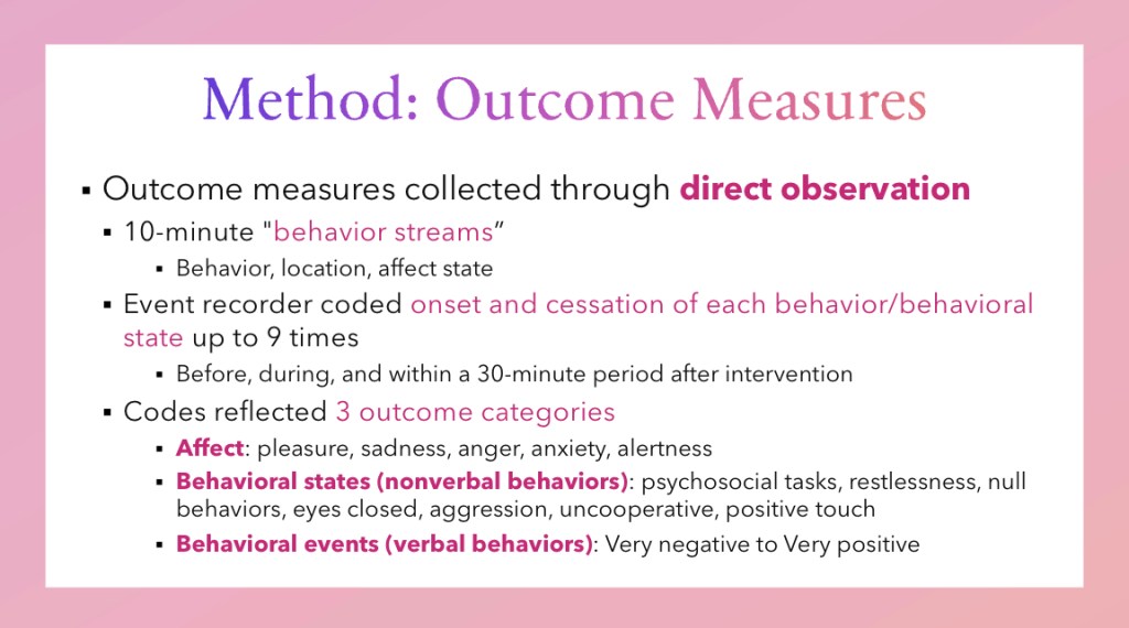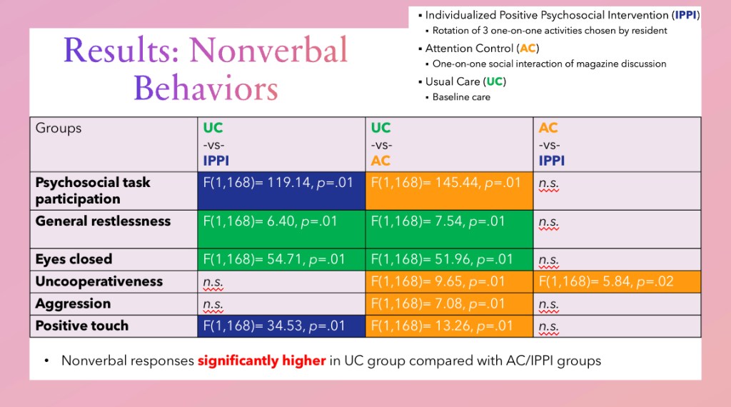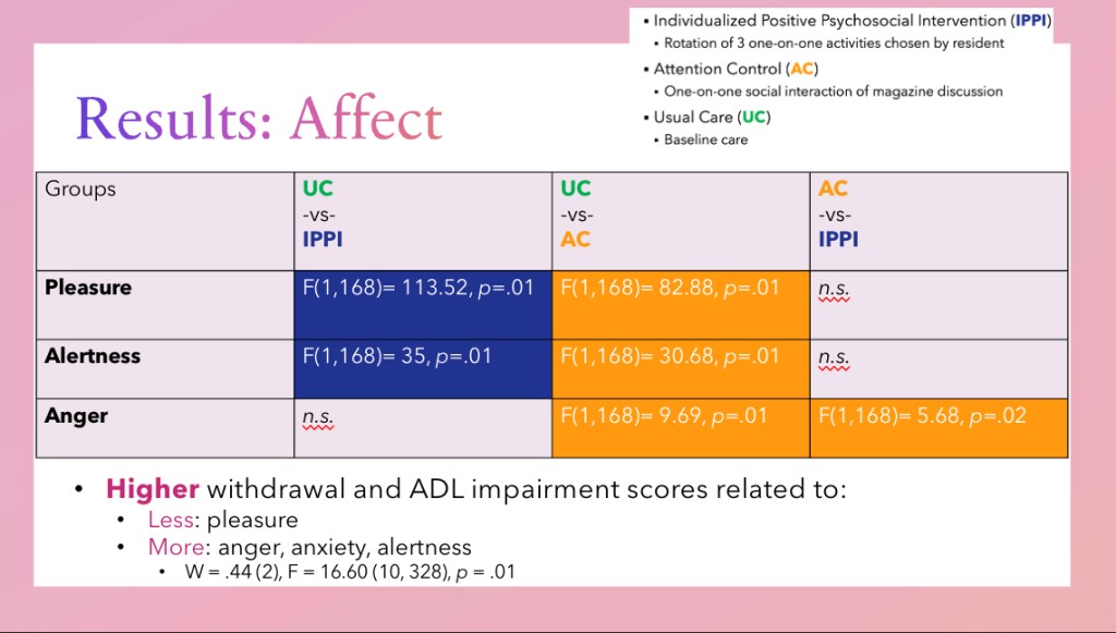 The results showed that overall, the residents receiving IPPI showed the greatest benefit, followed by AC. The AC group showed benefits and more negative behavior. This may be due to the adverse effects standardized one-to-one interventions can have on highly vulnerable populations. Limitations of this study include the lack of diversity in the sample, the line-observation coding system (only observing one behavior state at a time rather than multiple), and the research assistant’s influence throughout the study. Amber also pointed out the issues involving researching individuals in assisted living facilities. Family members can be quite protective of their relatives during their later years in life. In an attempt to protect their loved ones, they sometimes refuse to consent to studies like this. Whether it is the harsh language calling it an experiment, or lacking trust in research it is a struggle to reach this population despite the good it can do. Amber hopes to address these concerns and reduce the stigma associated with researching elderly people.