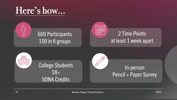 In Taylor’s proposed research design, different mediums will be used in order to display an individual groin through change. These mediums include visual media, auditory media, and text-based media. Participants will also be divided in whether they see a good person eventually do bad things or the opposite. They will witness this change in the person gradually and then be asked to come back in a week to complete a survey. Taylor hypothesizes that participants who see an individual changing from their initial behaviors will then change their perceptions sooner seeing good people doing bad things, rather than people hearing or reading about bad people doing good things. Taylor’s inspiration from her study comes from gaps in previous literature. Other studies have not considered the medium in which individuals learned about an individual, which grossly underestimates the amount that we learn about a person by seeing or hearing about them.