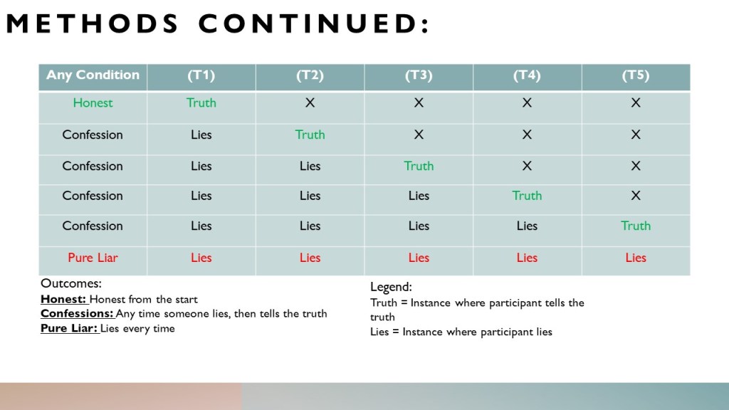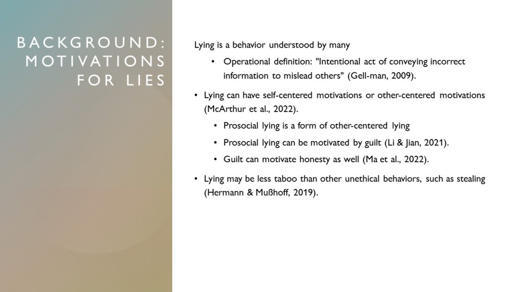 Paxton was able to present an upcoming study that will be conducted. Many of the details cannot be shared but what can be is the study’s focus on prosocial lying. Prosocial lies are those that benefit someone else rather than the teller of a lie. For example, parents who tell their kids that Santa is real are a form of prosocial lying. Telling the kids that Santa is real makes the children happy with little to no benefit to the parent telling the lie. Another example is complimenting a friend’s outfit that you may not like. You tell them it looks good despite your own truthful opinion to not hurt their confidence. Paxton successfully completed an application for the Provost Research Award Grant to get funding which is still being reviewed.