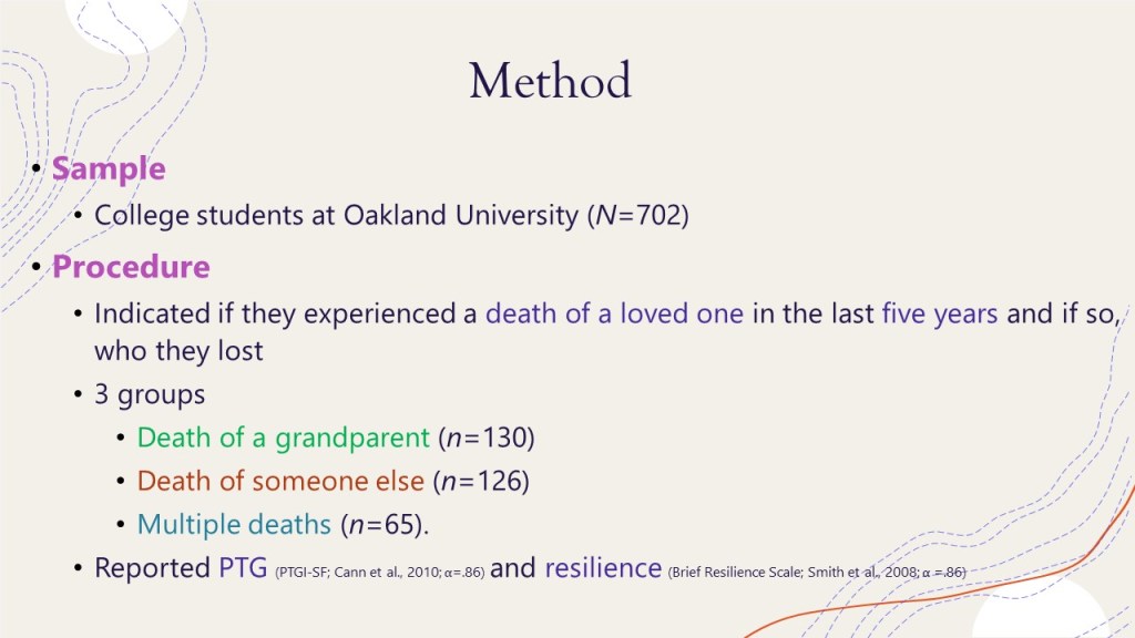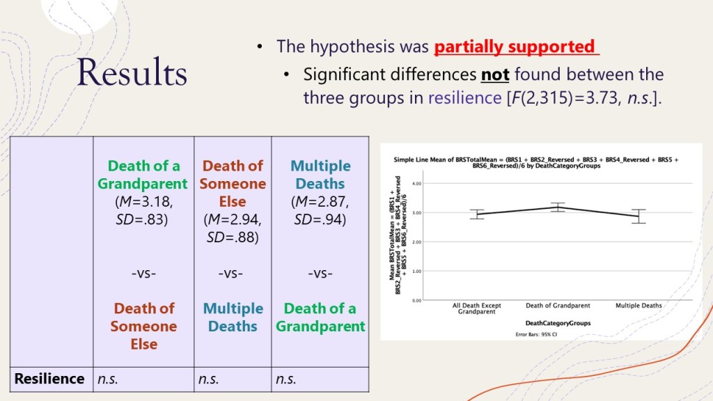 Amber’s presentation was about the effects of losing specific loved ones on PTG. Specifically, how loved grandparents could indicate higher rates of PTG and resilience more so than the death of other relatives. The idea behind this is thought to be that those who experience the death of a grandparent may have more of an expectation of their death. If a grandparent dies of old age or health-related conditions this may be more expected than the sudden death of a parent. Participants in the study were divided by the types of death experiences, whether that was a grandparent, anyone other than a grandparent, or multiple deaths (grandparents included). Results showed that there were significant differences between PTG for those experiencing the death of a grandparent and those experiencing the death of someone else. None of the groups differed significantly in resilience. Future research should consider the types of relationships an individual has with any type of relative. Individuals in this study could have been close with their grandparents which made the potential for growing stronger, while others had a distant relationship with an aunt. The types of relationships and their closeness could be a factor in the amount of PTG experienced.