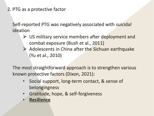 In addition to speaking about PTG and its relation to suicide prevention in her informative presentation, Dr. Taku also introduced an important question: Why do we need to know about PTG? PTG is a phenomenon that occurs when individuals who have experienced trauma at first struggle with the negative aspects of trauma, and then, via ruminations or other processes, strive to make positive changes in their life. Whether it be by self improvement, relating to family and friends more deeply, spiritual growth, greater appreciation for life itself or acknowledging the possibilities available, individuals are no longer victims but survivors paving their own path. For the purpose of this talk, Dr. Taku looked at PTG through the lens of suicide prevention, intervention, and postvention. However, she also noted that PTG has a variety of applications when it comes to mental health. More specifically, she mentioned how being aware of PTG can help individuals who experience anxiety live with their symptoms even if they are not reduced. As Dr. Taku clearly demonstrated in her presentation, there are a myriad of benefits to knowing what PTG is and how it can be applied.