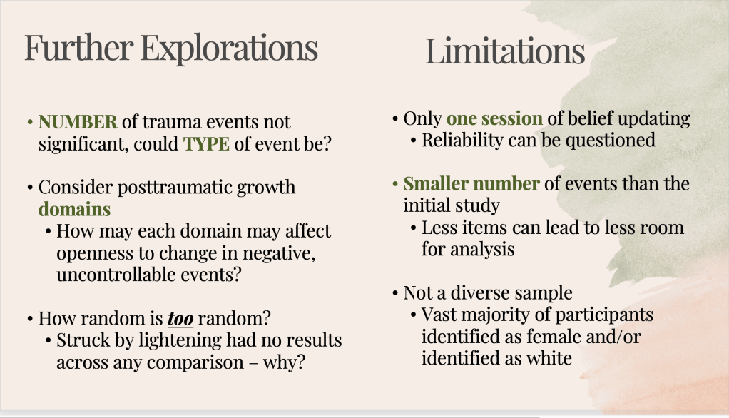 Limitations of this study include the fact that there is only one session of belief updating, so reliability may be questioned as well as the diversity of the sample. Future directions include looking into which traumatic events may affect the belief updating of the participant or how each hypothetical event’s lack of change could be do to the randomness of the event itself.