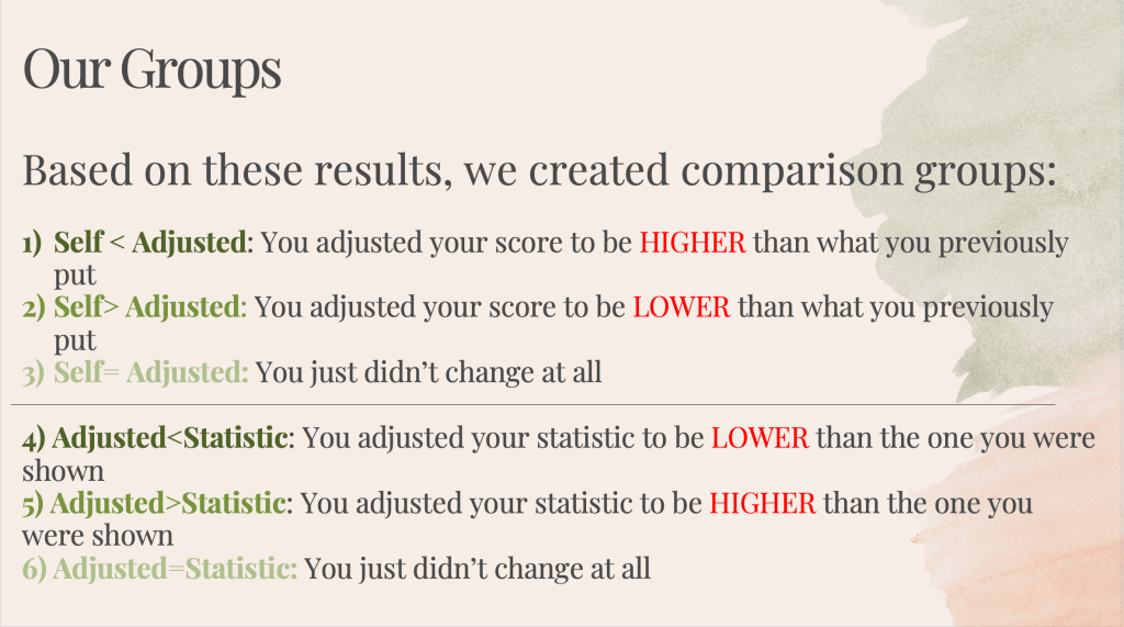 With that, Amber had worked on her own version of the Belief Update Task which was separated into three steps. The first presented the participant with 20 life events (e.g., ‘robbery’) and asked to estimate how likely the event is to happen to them in the future and how likely it is to happen to other college students in the United States. Then, information: presented with a fictional prevalence rate of the likelihood of event happening. Lastly, Second Estimate: asked again to provide estimates of their likelihood of encountering the same events. After splitting the sample into 6 different comparison groups (shown in the slides below) this study hypothesized that “people who rate themselves as more likely to experience negative life events when shown a lower statistic will show less openness to positive likelihood change for negative, uncontrollable life events”