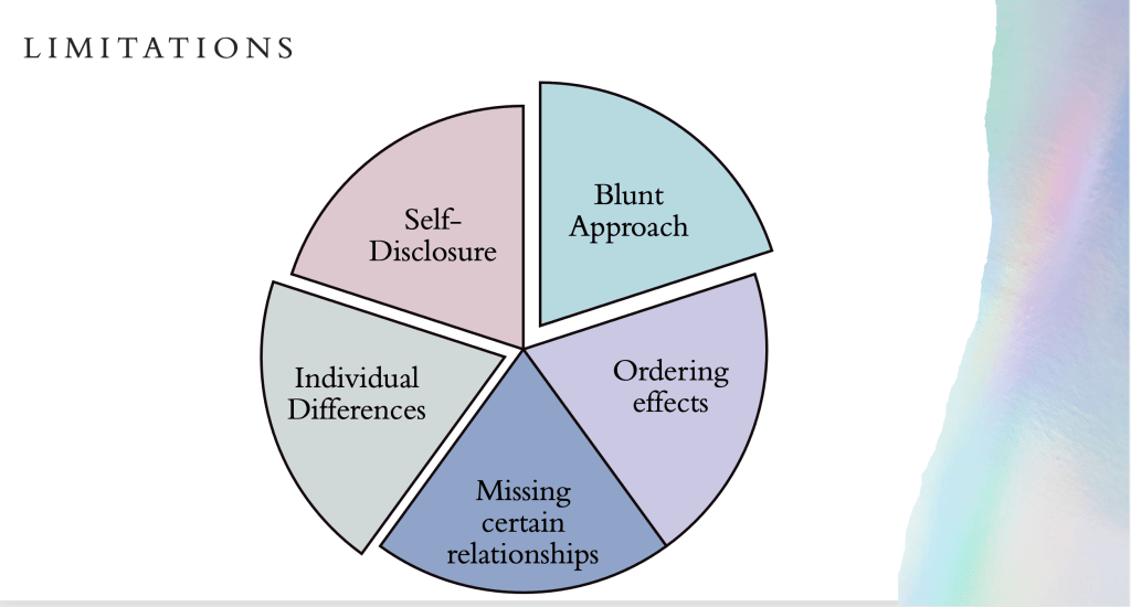 The limitations of the proposed study include individual differences, ordering effects, and what is considered a blunt approach to Self-Disclosure that is replicated during this study.