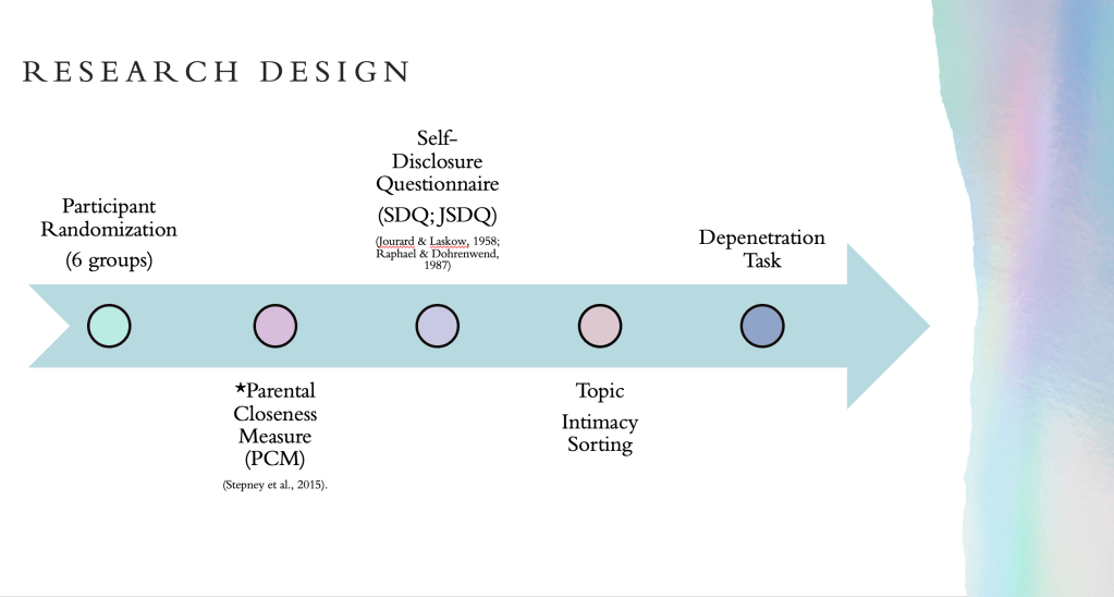 The study will have a Quasi-Experimental, 2×3 repeated measures factorial design requiring 366 participants. The participants will be randomized into 6 groups, complete the Parental Closeness Measure (PCM), the Self-Disclosure Questionnaire (SDQ;JSDQ), complete intimacy sorting to decipher what information is more or less valuable per each participant, and a depenetration task.