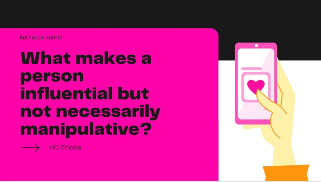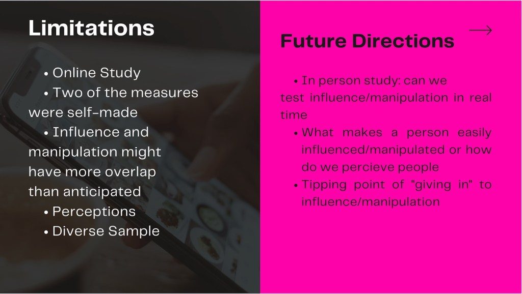 In her presentation, Natalie allowed us not only to gain insight into the topic of manipulation and influence, but also provided us with a better understanding of what can be researched next. She proposed that future research into this topic might include looking at tipping points of when people succumb to manipulation or influence. Additionally, one might consider looking into the differences between those who are easily manipulated or influenced and those who are not.