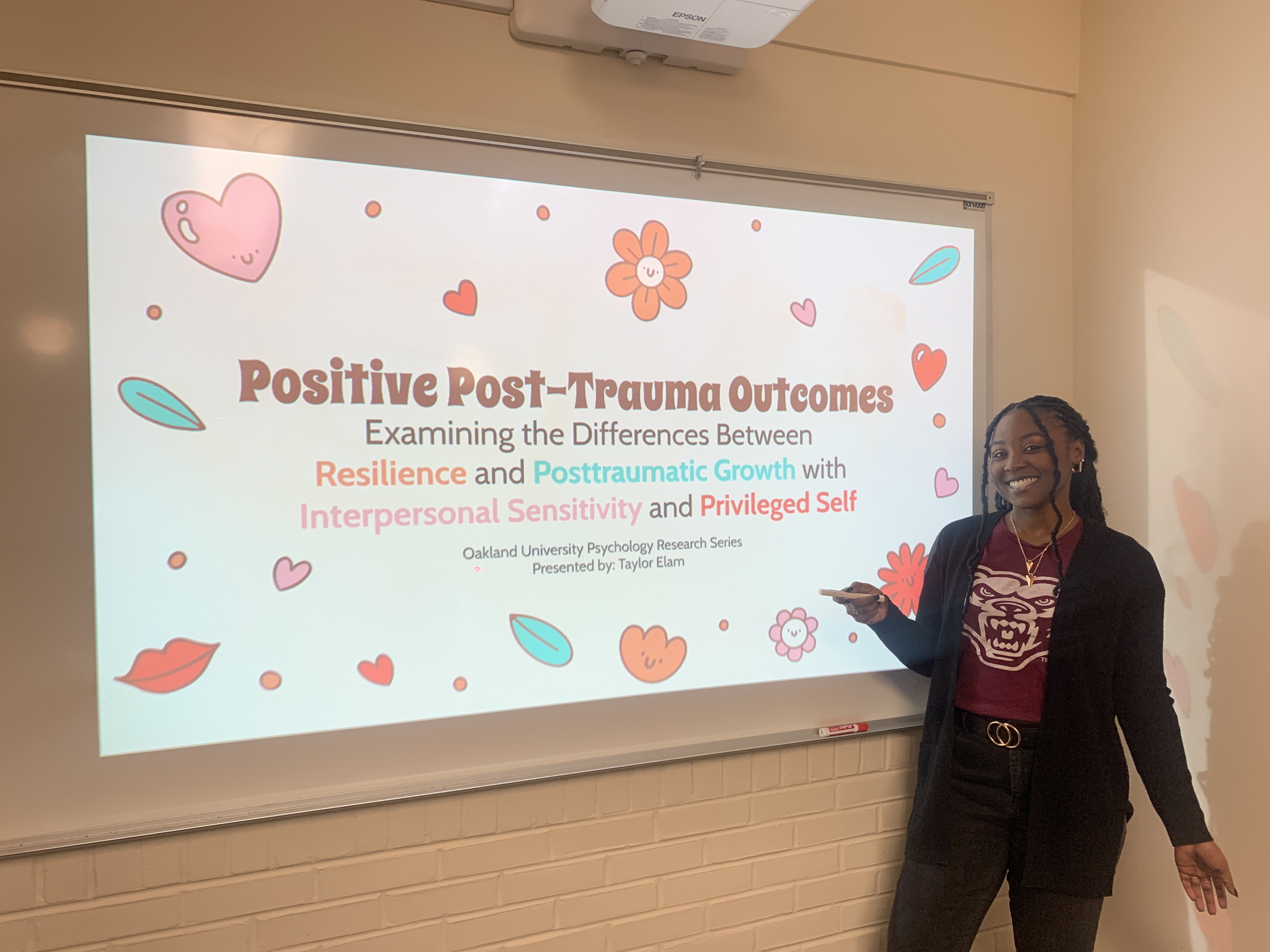 This past week, Taylor Elam, a current PhD student in the FF-PTG Lab, gave a presentation in preparation for her departmental talk this week. She started out by explaining some of the pertinent topics that related to her thesis such as resilience, post-traumatic growth (PTG), interpersonal sensitivity, and self-privilege.