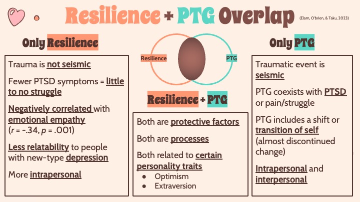 Here at the FF-PTG lab, we are no stranger to the concept of PTG, and in her presentation, Taylor expanded on this topic. She provided helpful examples of what post-traumatic growth can look like in real life, furthering our knowledge and understanding of what PTG is and what outcomes it can lead to. She also noted the distinction between resilience and PTG. She explained that while both can lead to positive psychological outcomes and that both can be related to personality traits such as optimism and extraversion, the two terms should not be used interchangeably. When people experience PTG, they often have faced a seismic traumatic event that led to pain and struggle. When people experience resilience, on the other hand, they may not have perceived their trauma as seismic and tend to have little to no struggle. Additionally, experiencing PTG tends to be both an intrapersonal and interpersonal process, while experiencing resilience tends to be a more intrapersonal experience.