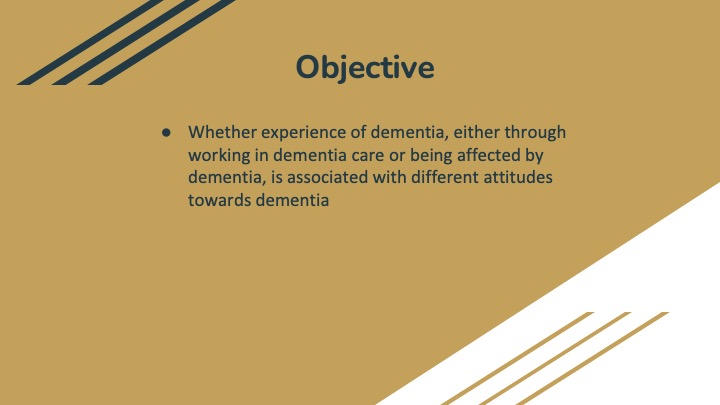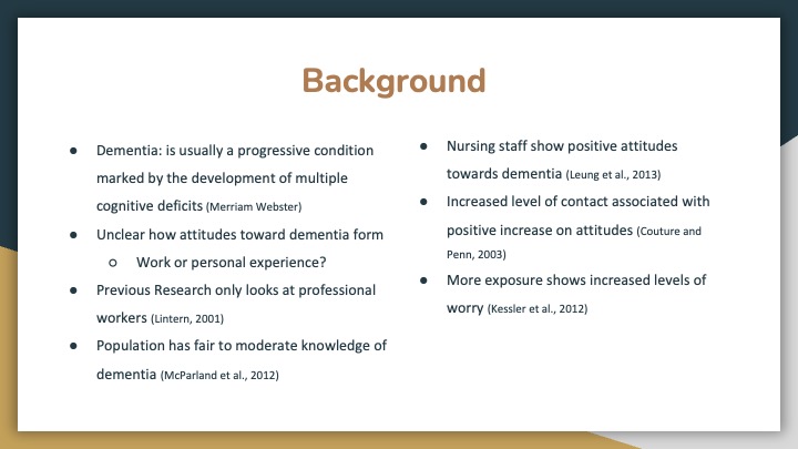 Wyatt started out by talking about the main objective of this study, which was to look at whether people’s personal experiences with individuals with dementia, either via working with dementia patients or being affected by dementia in another way, is associated with different attitudes toward dementia. He went on to provide background information regarding the study. He included a definition of dementia, which is a progressive condition marked by the development of multiple cognitive deficits. He also explained that previous research on this subject mainly focused on dementia through the lens of professional healthcare workers.