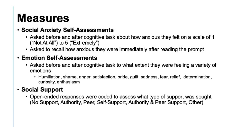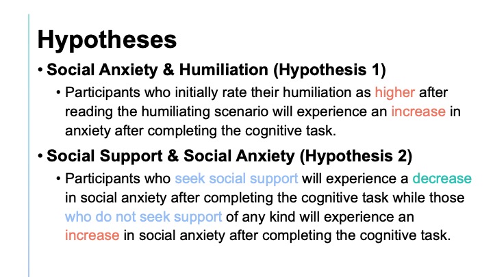 After laying the background information out, Avery went over the study’s hypotheses thoroughly. More specifically, she was interested in looking at how changes in social anxiety levels were influenced by factors such as anticipated social support and humiliation. She then went over how many people participated in her study, the procedure of the study, the vignette for the study, and the measures included in the survey. For instance, she explained that the current research was conducted using an online survey in which participants read a vignette to introduce humiliation. After reading the prompt, participants were instructed to imagine what would happen as a continuation of the vignette if they were the person described in the story. She explained that participants could relay what they imagined via open-ended responses which were coded for the purpose of this study’s analyses.