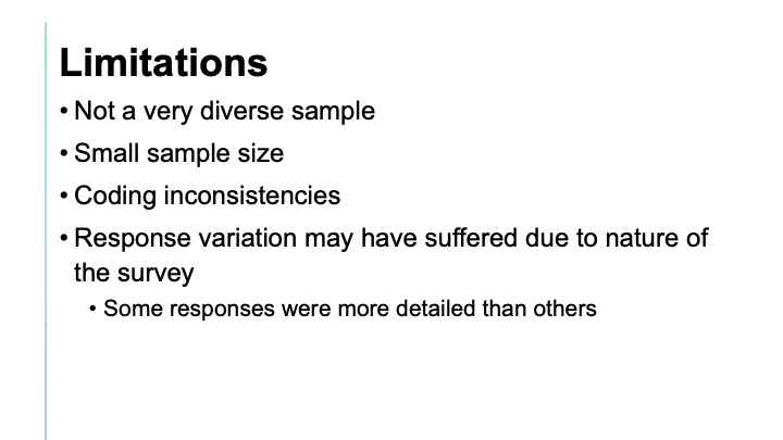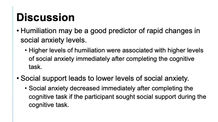 At the end of her presentation she went on to show the results of both her hypotheses and discussed her findings. She was able to show that both social support and humiliation predict rapid changes in social anxiety levels. She mentioned that the implications for these findings were plentiful, with the potential for results such as these to influence the creation of new coping strategies or interventions for socially anxious individuals. She also mentioned any limitations to her study, including coding inconsistencies and lack of response variation.