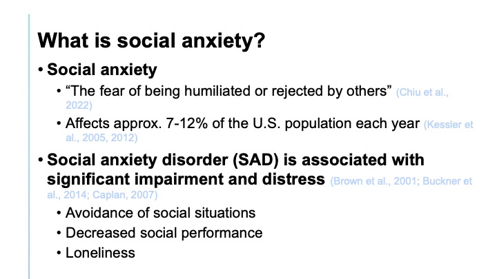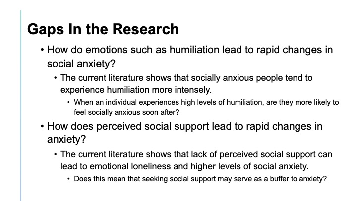 Avery started off her presentation by providing background information to what social anxiety is and what might contribute to it. She mentioned there was a link between intense feelings of humiliation and heightened social anxiety.She also explained that social anxiety has been linked to greater feelins of emotional loneliness. She then went on to describe gaps in the research, including the lack of literature regarding rapid changes in social anxiety and what might contribute to immediate increases or decreases in social anxiety levels.