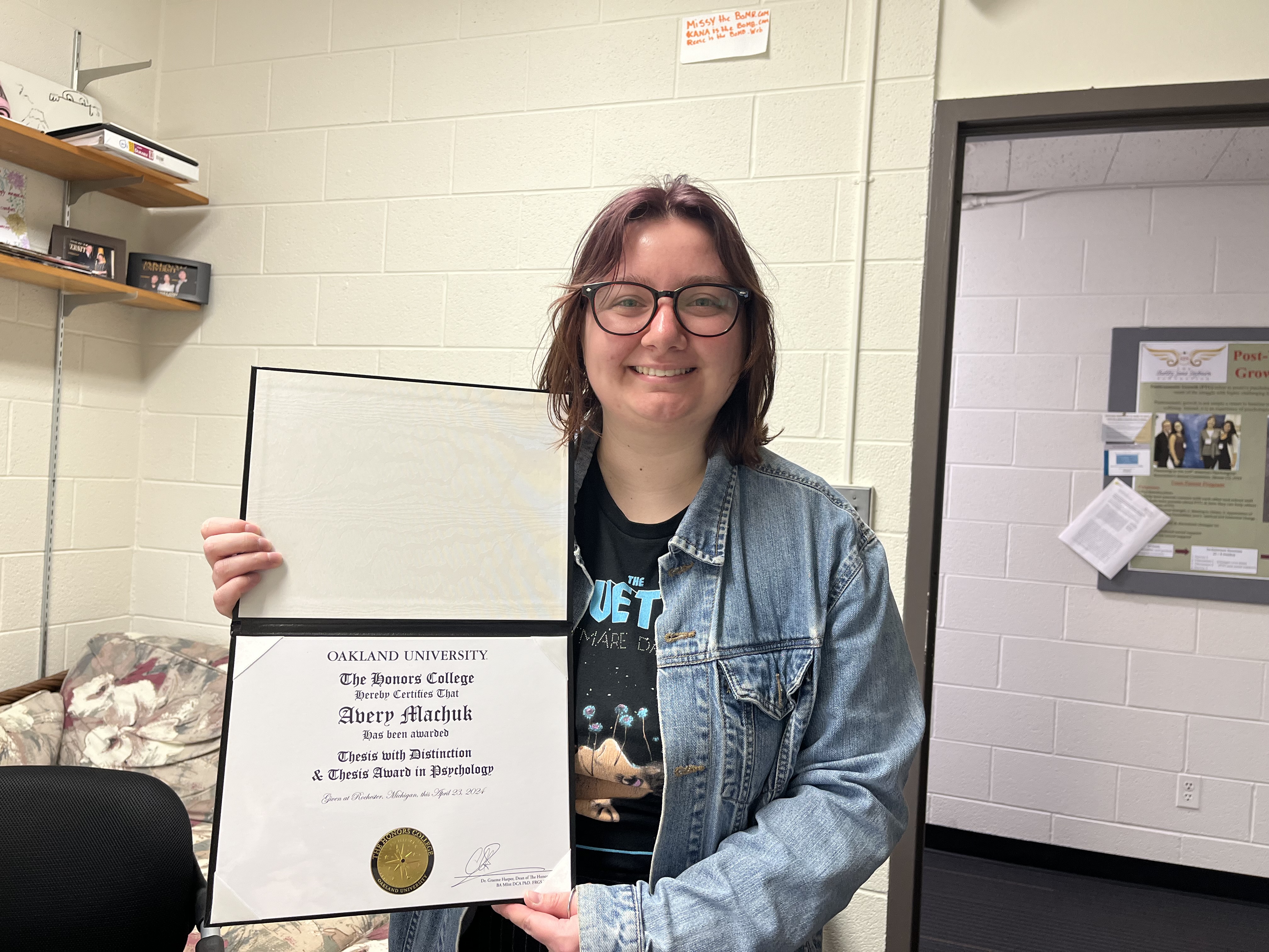 Avery graduated from Oakland University with a B.A. in psychology. As a part of Oakland University’s Honors College, she recently received a thesis award in psychology for her Honors College thesis regarding changes in social anxiety. Avery will be attending the University of Michigan in the fall as a graduate student in their Master of Social Work program.