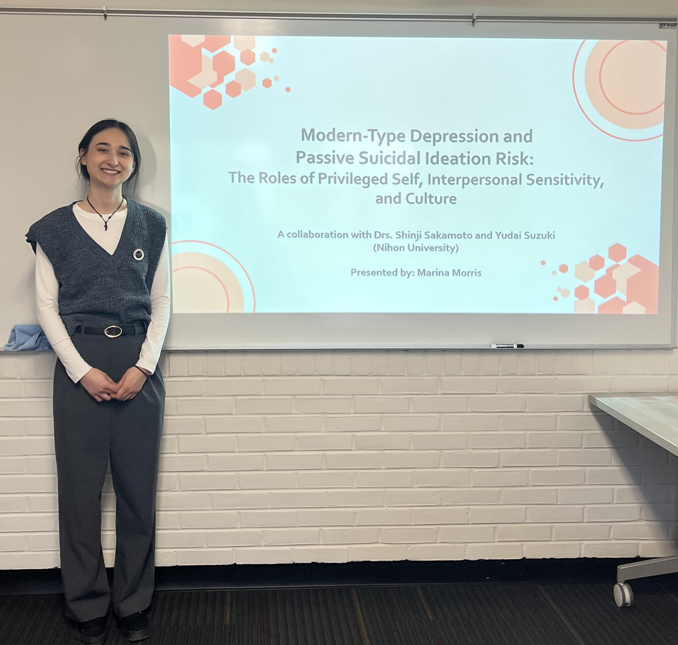 Last week, Marina Morris, a graduate student in the FF-TIP lab presented new study at the psychology departmental research series where faculty and students meet to learn about ongoing projects. The presentation Marina gave is titled “Modern-Type Depression and Passive Suicidal Ideation Risk: The roles of Privileged Self, Interpersonal Sensitivity, and Culture”. It is a collaborative study with Dr. Taku’s colleagues in Japan. In fact, Marina gave the same presentation in Japanese the other day.