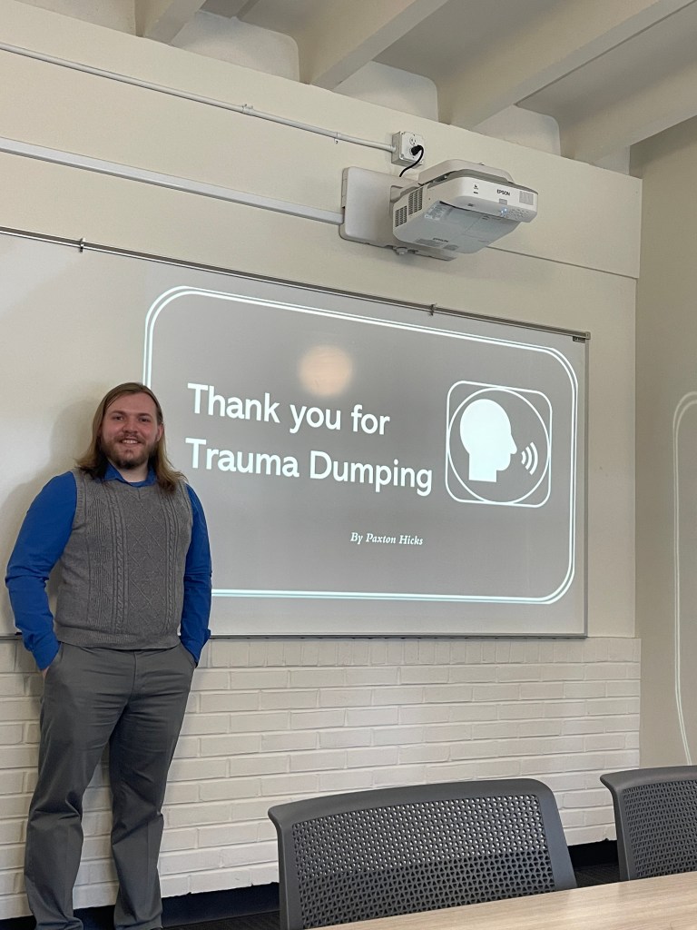 This month, Paxton Hicks, a second-year master’s student in the FF-TIP Lab, gave a departmental talk titled “Thank you for Trauma Dumping” to the Psychology students and faculty. He started by giving two scenarios, one of a conversation between Trisha and Andrew and the other of a conversation between Amy and Derrick. By using these scenarios he presented his new research ideas to enhance Social Penetration Theory.