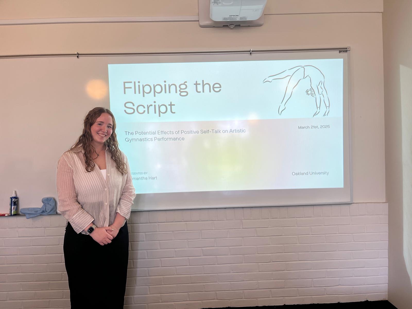 During her presentation, Sam presented various literature providing the necessary background information on both gymnastics and self-talk for her thesis. This demonstrated the current ways self-talk is being used in sports and the gaps in literature surrounding self-talk and gymnastics.
