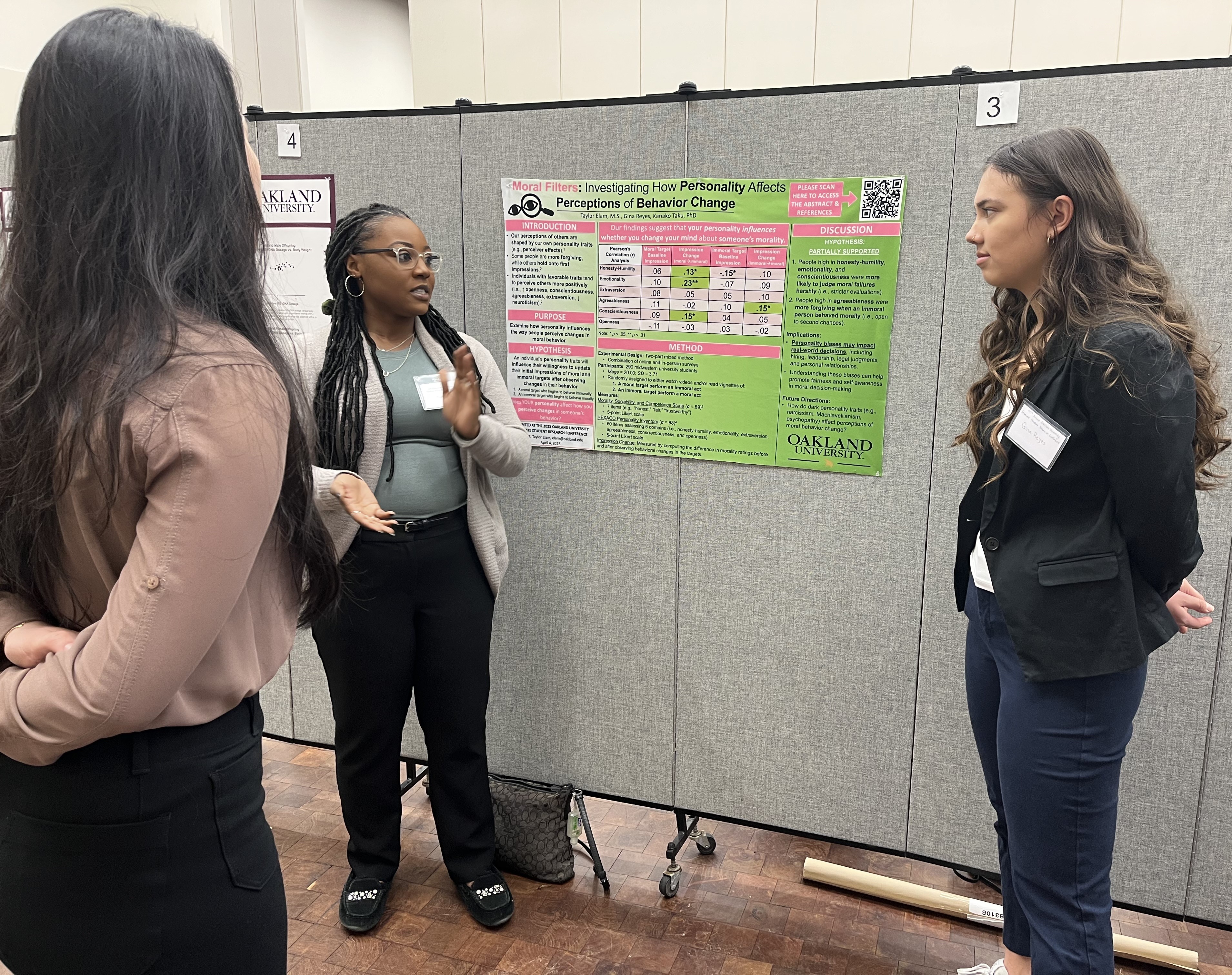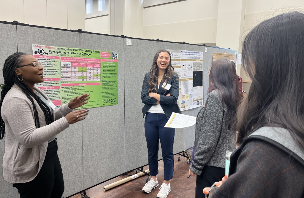 On April 4, 2025, Taylor Elam and Gina Reyes presented a study, “Moral Filters: Investigating How Personality Affects Perceptions of Behavior Change”, at the Graduate Student Research Conference at Oakland University.