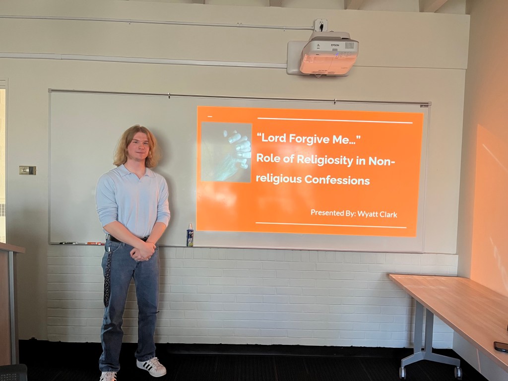 Recently, in the FF-TIP Lab, Wyatt Clark, a senior undergraduate student, presented his research poster for the upcoming Midwestern Psychological Association (MPA) Conference. The presentation, titled “Lord Forgive Me…” Role of Religiosity in Non-religious Confessions, examined the role of religiosity in non-religious confessions, specifically focusing on how one’s level of religiosity influences the likelihood of confessing after witnessing cheating behavior.