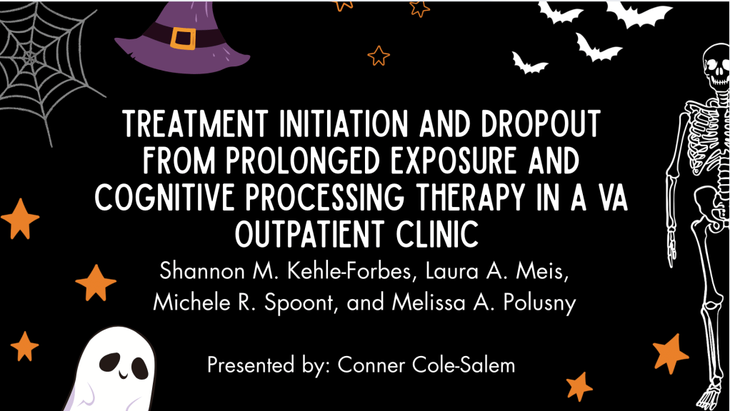 During the presentation, Conner explained the difference between Prolonged Exposure Treatment (PE) and Cognitive Processing Therapy (CPT), the two therapeutic treatments examined in the study. He also shared with us some potential factors that predict dropout, such as PTSD symptom severity, military service era, age, medium of treatment (e.g., Telehealth or in-person), etc.