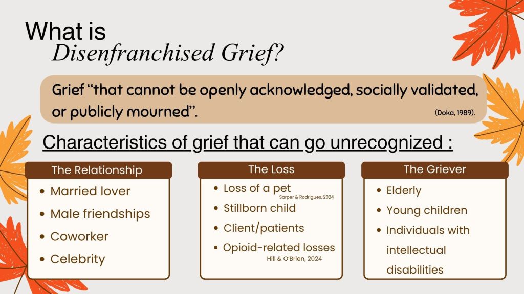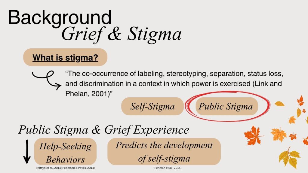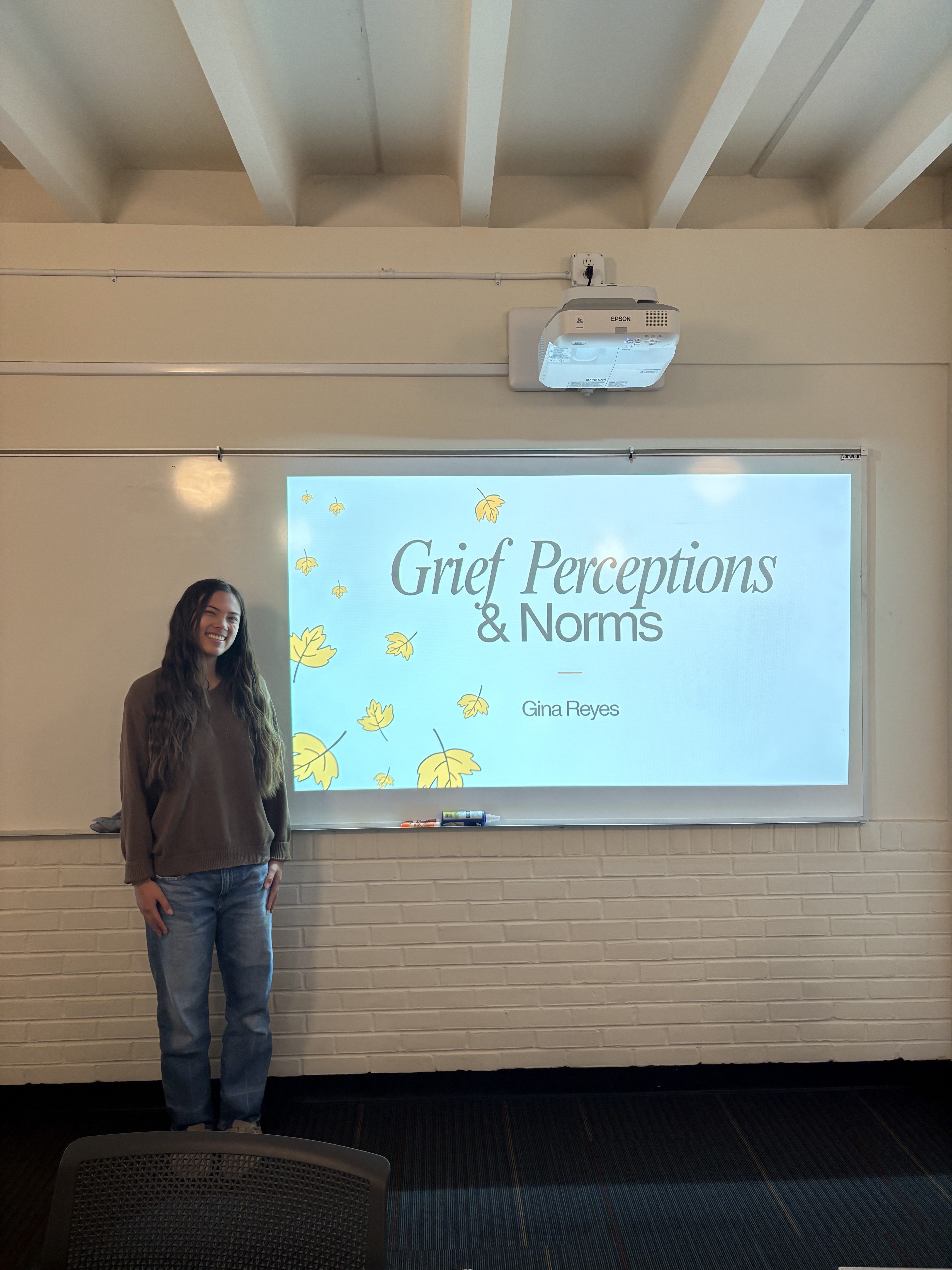 Recently, Gina Reyes, a senior undergraduate research assistant, gave an insightful presentation on her independent study titled “Grief Perceptions & Norms.” To begin, Gina described how societal beliefs and expectations about grief can shape what is considered a “normal” or “healthy” grieving process—often leading to disenfranchised grief, or grief that is not socially recognized or supported. She highlighted the role of stigma in these experiences, which inspired her overarching research question: Can brief educational and contact-based interventions reduce stigma and reshape beliefs surrounding disenfranchised grief?